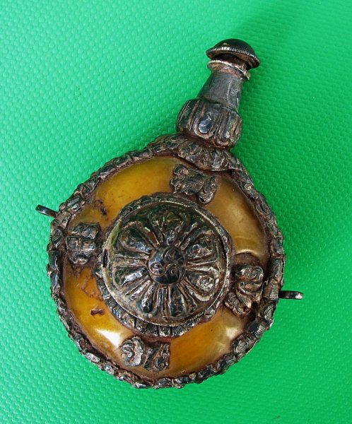 Hier ein alter , gebrauchter Behälter ein sogenannter Snuffbottle . Bernstein - Metall , Durchmesser 63mm. Rest siehe Bilder.