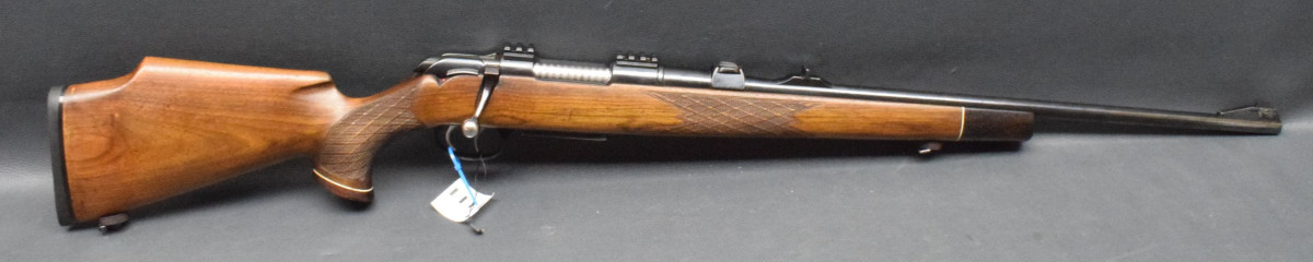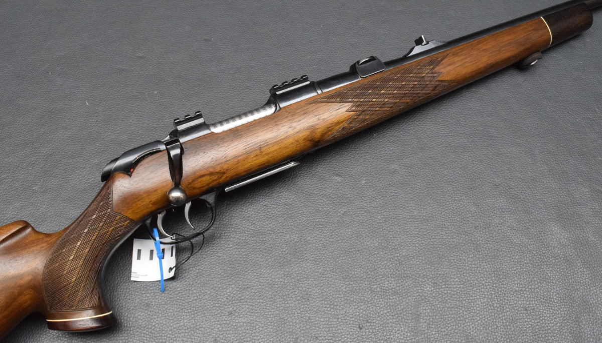 justierbare Visierung, Zylinderverschluß mit Sonnenschliff, deutscher Stecher, seitliche Schiebesicherung, herausnehmbares 3-Schuß Magazin.