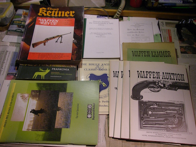 Habe aufgeräumt, muß mich verkleinern. Gebe ab ein Konvolut von insgesamt 13 Katalogen, Schriften Büchern...Das sind: 1. Frankonia Jahreskatalog -Jagd und Sportschießen- 2015/2016; das sind über 600 Seiten Angebote über Jagd,-Kleidung, Waffen, Sportschießen, Wiederladen usw; 2. Eduard Kettner- Hauptkatalog 1993/94 = ähnlich wie Nr.1, aber vor 30 Jahren! auch über 600 Seiten.3."Wiederladen mit Johannsen" Nr.8 (1996)- der jedem Wiederlader bekannte und beste Wiederladekatalog. Bei Johannsen in Neumünster bekommt man auch heute noch alles, was man zum Wiederladen von Patronen braucht. 4. Jagen mit Kugel und Schrot (von 1997). eine ausführliche Broschüre von Dynamit Nobel mit Tips von Spezialisten über das damalige Patronenangebot von RWS , -mit ballistischen Munitionstabellen für jede angebotene Patrone bis 300 m Entfernung. 5. bis 9. fünf Kataloge von Lothar Heubel= "Waffenkammer" bzw. "Waffen-Auktion" aus den Jahren 1972 und 1973, in denen historische Waffen, Degen , Säbel ,Helme, und weiteres Zubehör mit Bildern und genauen Beschreibungen und den richtigen Namen( die ich kaum kannte)und damaligen Schätzpreisen dargestellt wurden: für den Antik Sammler wertvolle Unterlagen! Die vorgenannten Schriften von 1 bis 9 haben alle mindestens DIN A4 -Größe und wiegen zusammen 3,8.- kg.--------10.Waffen Revue Nr. 82 von 1991: hier werden einige Militärwaffen aus den Weltkriegen dargestellt.11. Englischer Katalog: "The Bisley Pavilion" von 2004 über antike Waffen.. 12.