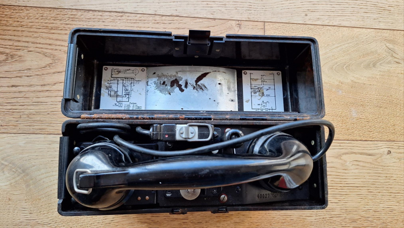 Der Apparat ist komplett mit Hörer, Kurbel, Kabel und interner Beschriftung. Innenliegendes Schaltbild auf Aluminiumplatte vorhanden.