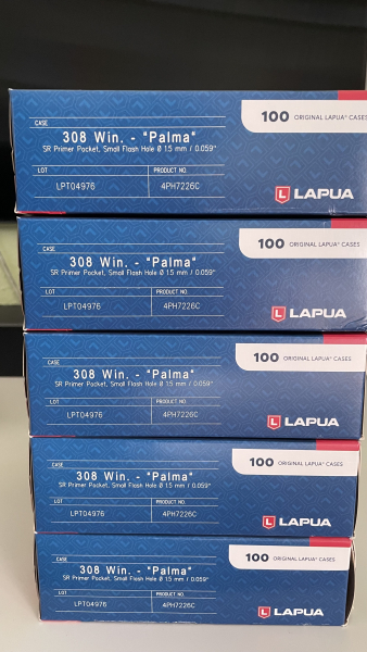 ich verkaufe 5 x 100 Hülsen Lapua 308 Palma, neu, original verpackt, ungeöffnet.