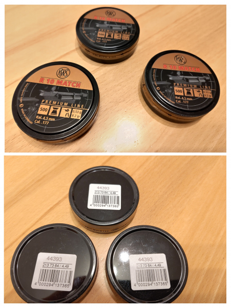 Verkaufe wegen Umstieg auf anderes Fabrikat 3 Dosen RWS R10 Match LG Munition (3 x 500 Diabolos). Details siehe Fotos, Dosen sind ungeöffnet.