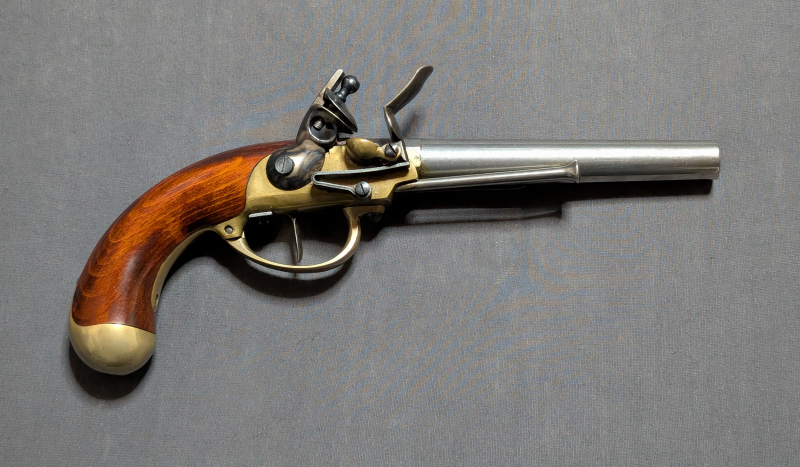 Angeboten wird hier eine Steinschlosspistole Made in Italy im Kaliber .69. Lauf ist blank. Glatter lauf. Schloss funktioniert einwandfrei in beiden Positionen. Mit Gürtelhaken. Vorne an der Mündung ist eine kleine Fehlstelle.