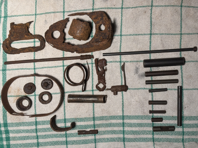 Rostige Originalstücke plus ein kompletter Satz an Splinten und Bolzen für das Sturmgewehr