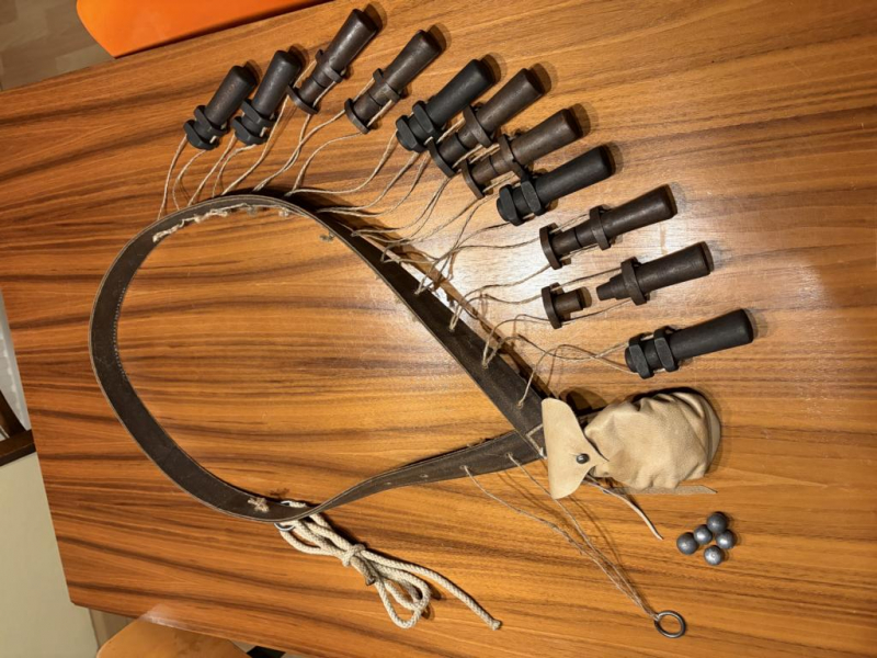 Das zu verkaufende Bandelier besteht aus einem stabilen Riemen, an dem elf hölzerne Pulvermaße mit Flachsschnüren befestigt sind. Ein Pulvermaß kann die exakte Menge Schwarzpulver für einen Schuss mit einem Rad- oder Luntenschlossgewehr beinhalten. Wie bei einigen historischen Originalen sind zwei verschiedene Formen von Pulvermaßen am Bandelier befestigt. In einem Lederbeutel, dessen Form sich ebenfalls an historischen Originalen orientiert, können Bleikugeln oder weitere Kleinteile aufbewahrt werden. Im Lieferumfang sind zudem fünf Bleikugeln zu Anschauungszwecken enthalten. Auf der Rückseite befindet sich ein kleiner Ring, an dem eine Zündkrautflasche befestigt werden kann. An einem größeren Ring befindet sich Ersatzlunte. Dieses Detail ist ebenfalls an den historischen Originalstücken zu sehen.