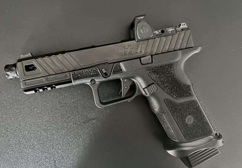 verbaut. Die Trigger-Einheit wurde eigens dafür von Jonny Glocks USA nach Deutschland importiert und fachmännisch eingebaut. Die tiefe Laufachse der ZEV OZ9 ermöglich mit dem passenden RMR-Cut eine extrem tiefe Monatge für einen Rotpunkt wo hierbei ein Trijicon RMR V2 verbaut wurde.
