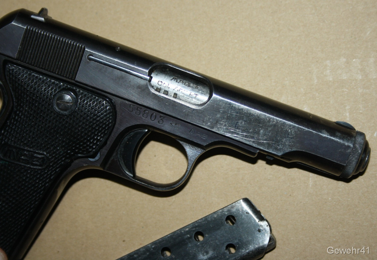 Aus langjähriger Sammlung kommt hier diese wirklich sehr schöne Wehrmacht Pistole Mab D im Kal. 7,65mm Br. zur Auktion. Mit WaA-Stempelung. Komplett mit dazugehörigem Holster und Reserve-Magazin. Alles TIP TOP! Lauf und Funktion einwandfrei.