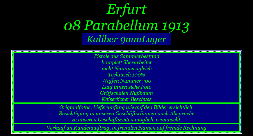Bei der angebotenen Ware handelt es sich um eine gebrauchte Waffe, die einen historischen Wert als Sammlerstück hat und zudem als Antiquität zu bezeichnen ist. Entsprechend der Ziff. 18 der VERORDNUNG (EU) 2023/988 DES EUROPÄISCHEN PARLAMENTS UND DES RATES vom 10. Mai 2023 über die allgemeine Produktsicherheit, zur Änderung der Verordnung (EU) Nr. 1025/2012 des Europäischen Parlaments und des Rates und der Richtlinie (EU) 2020/1828 des Europäischen Parlaments und des Rates sowie zur Aufhebung der Richtlinie 2001/95/EG des Europäischen Parlaments und des Rates und der Richtlinie 87/357/EWG des Rates" ist diese Verordnung auf dieses Sammlerstück nicht anwendbar.