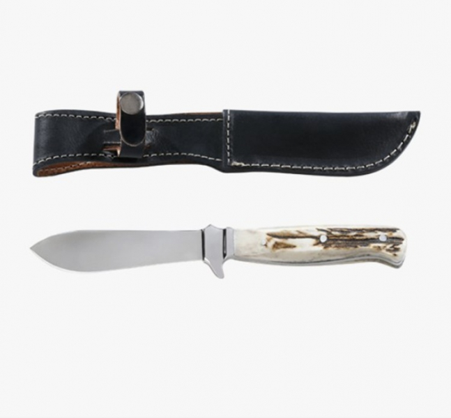 Der Jagdnicker verfügt über eine 10,5 cm lange Klinge aus hochwertigem 440C-Stahl mit einem ausgeprägten Bauch, der optimale Schnittleistung gewährleistet. Der Griff aus edlem Hirschhorn sorgt für eine angenehme Handhabung und einen traditionellen Look. Mit einer Gesamtlänge von 23 cm ist das Messer vielseitig einsetzbar und gut ausbalanciert. Im Lieferumfang ist eine schwarze Lederscheide enthalten, die für sicheren Transport und Aufbewahrung sorgt.