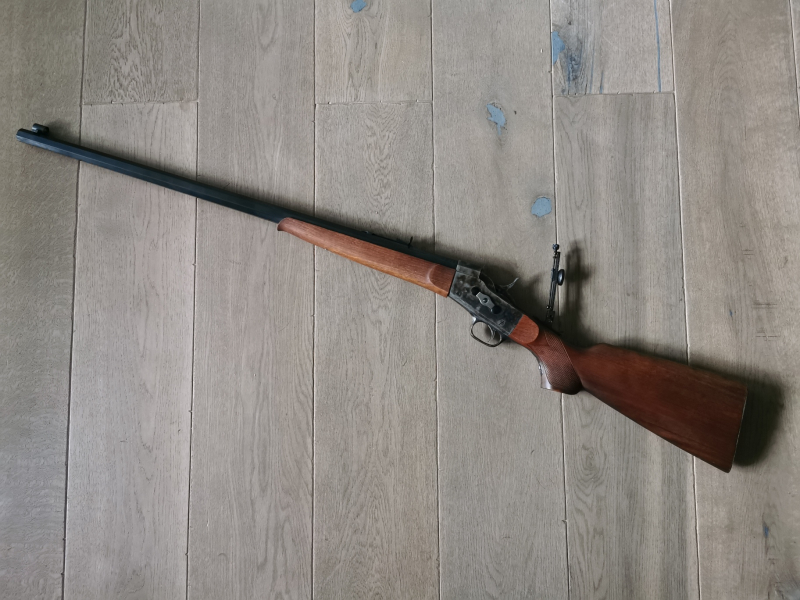 Zum Verkauf kommt eine wenig geschossene Pedersoli Cat. 3523 Rolling Block im Kaliber .357Mag mit Spindeldiopter. Der Hinterschaft hat auf der rechten Seite kleinere Fleckchen (siehe Fotos).