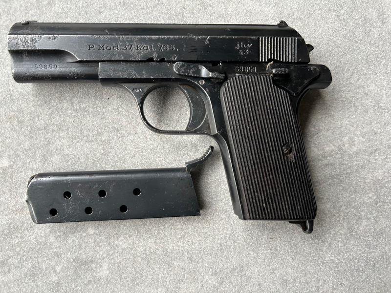 Pistole Femaru Modell 37 Kaliber Kaliber 7,65 Browning. Code jhv 43 -Wehrmachtabnahme WaA 173 im Fundzustand. Bestimmt zu verbessern durch eine Reinigung. Lauf blank. Original Magazin. Nummerngleich. Rechte Griffschale hatte einen Riss, wurde fachmännisch repariert. Die Pistole wurde so in der Pistolentasche Jahrzehnte lang gelagert und daher die Narbenbildung. Pistole stammt aus einer Sammlung, wird im Kundenauftrag verkauft. Ohne gültigen Beschuss, d.h. Verkauf nur an Sammler, Händler, Export. Differenzbesteuerung. Alle Angaben nach bestem Wissen und Gewissen. "Beantworte keine E-Mails". Den beschriebenen Zustand entnehmen Sie bitte aus den Bildern. Internationaler Versand ist nur möglich, wenn Sie mir Ihren deutschen Waffenhändler nennen, der den Waffenexport für Sie übernimmt.