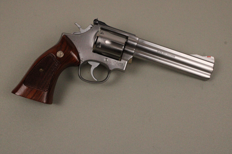 Angeboten wird ein gut erhaltener Smith & Wesson Revolver Modell 686-3 in .357Magnum mit 6 Zoll Lauf. Der Revolver hat ein Square-Butt Griffstück und ist aus dem Jahre 1992. Es handelt sich noch um das Modell mit dem Schlagbolzen im Hahn. Die Visierung ist voll einstellbar und die Schussleistung ist einwandfrei. Die Magnummrille ist sehr leicht sichtbar (siehe Bild 3). Neben den verbauten neuwertigen original S&W Griffschalen ist noch ein Pachmayr Gummi-Griff im Angebot inkludiert.