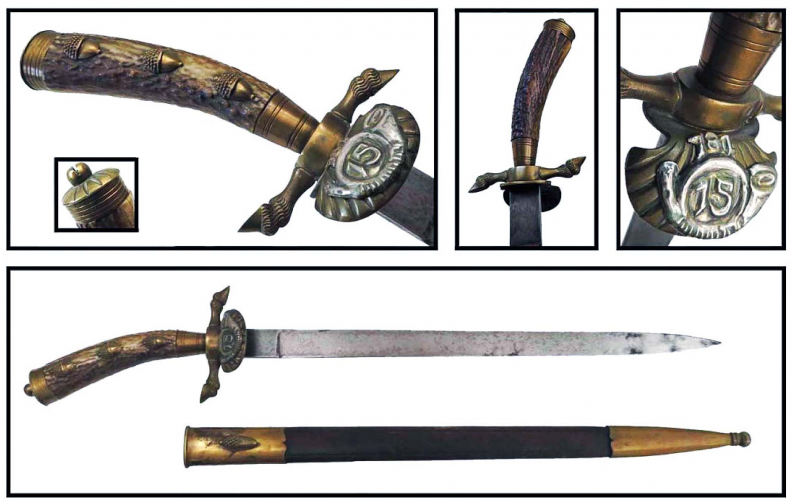 Seltener sächs. Extra-Hirschfänger nach 1900, geführt im 15. Kgl. Sächs. Infanterie-Regiment Nr. 181. Messing-Kreuzgefäss mit Muschel-Stichblatt und aufgelegten, silberfarbigem Jagdhorn mit Zahl "15" und zusätzlicher "181". Auf Klinge noch schwach erkennbare Ätzungen mit militärischen Trophäen, Blatt- und Rankenwerk. Dazugehörige, geschwärzte Lederscheide mit glatter Messing-Montur.