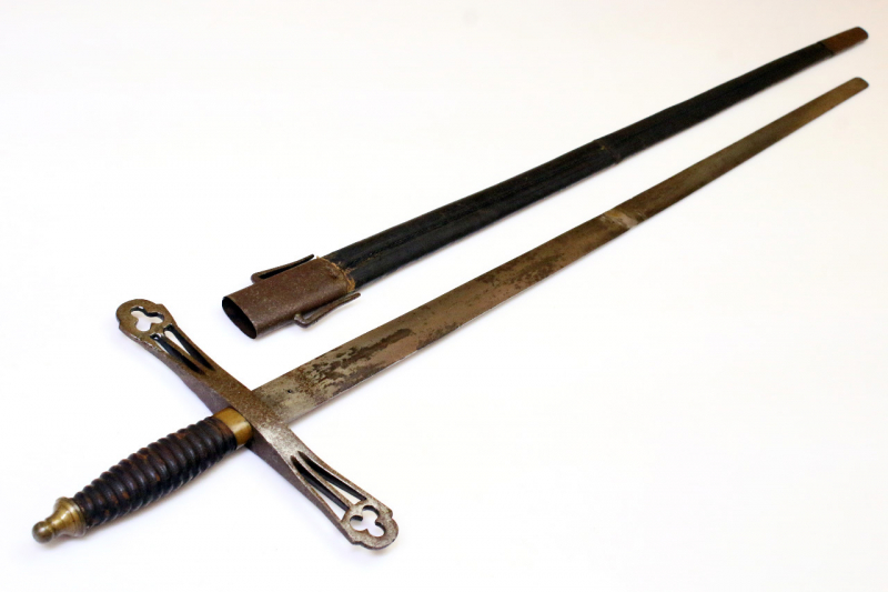 Der Griff mit durchgehendem Erl. Belederte Griffhilze. Griffzwinge und Knauf aus Buntmetall. Massives, durchbrochen gearbeitetes, eisernes Parier. Der Griff mit Altersspuren. Das Parier etwas gelockert. Die Belederung der Hilze intakt.