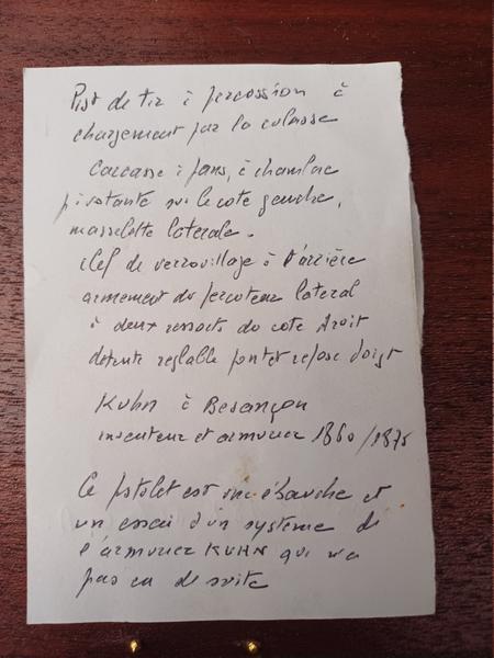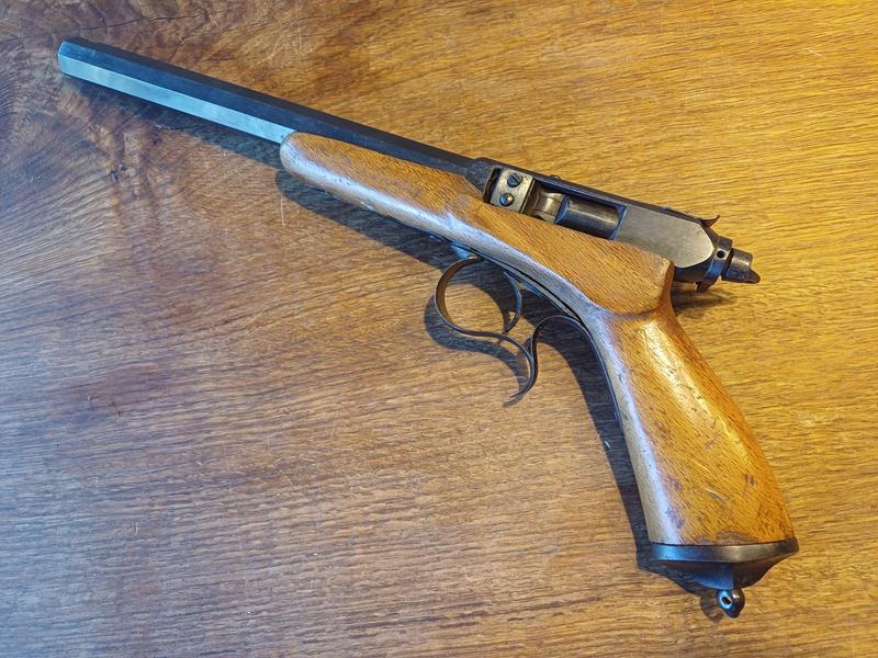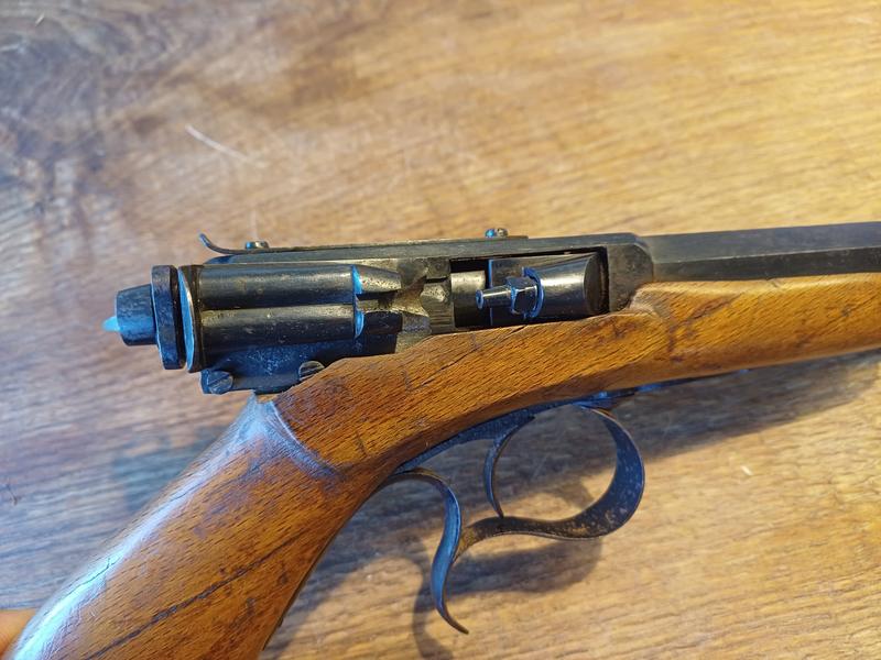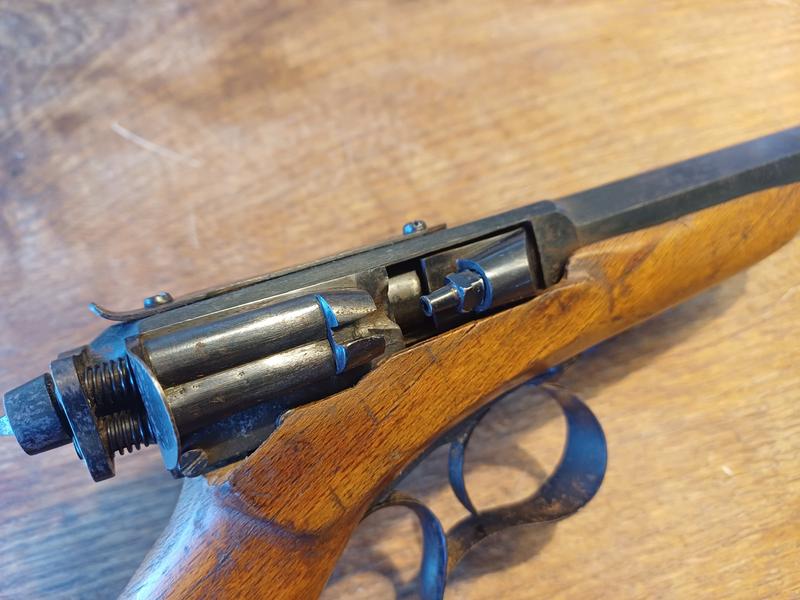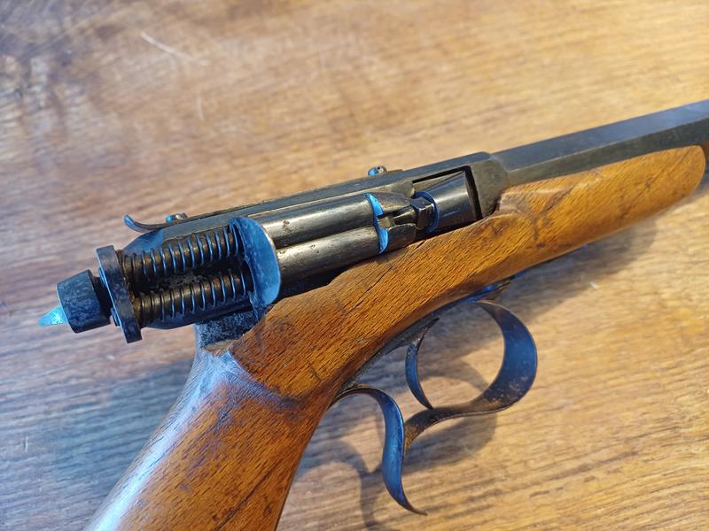 Zur Funktionsweise: Zunächst wird das Schlagstück gespannt. Anschließend wird die Kammer mittels des hinteren Flügels aufgeschraubt und dann nach links ausgeschwenkt. Jetzt kann die Papierpatrone eingesetzt werden. Kammer wieder einschwenken, zuschrauben und Zündhütchen aufsetzen. Schlagstück bis ganz nach hinten ziehen. Jetzt ist die Waffe gespannt und schussbereit.