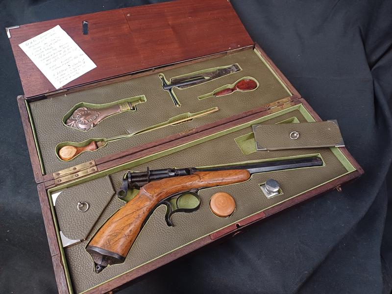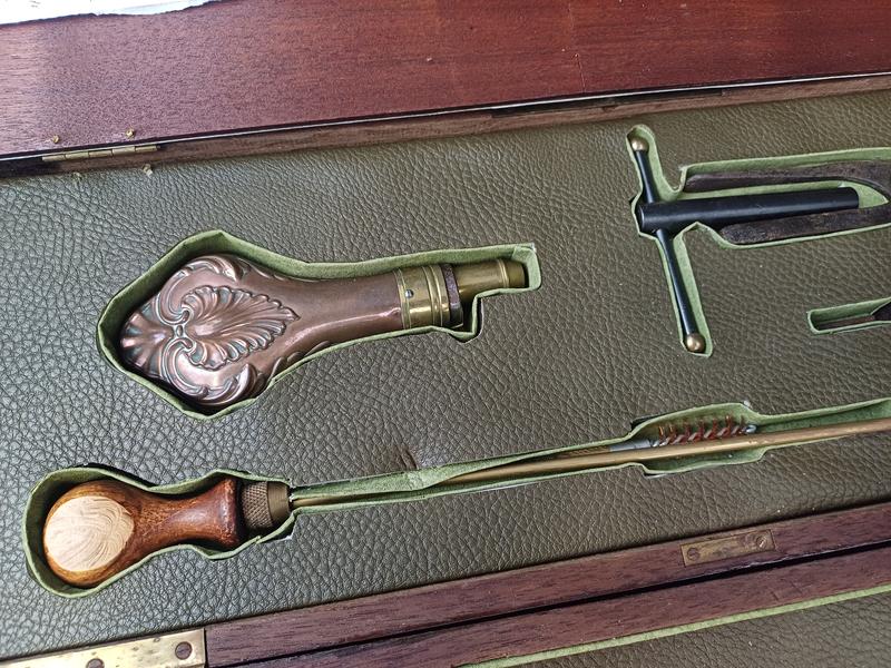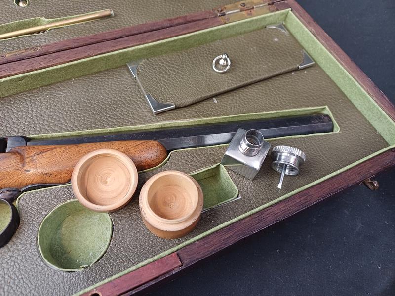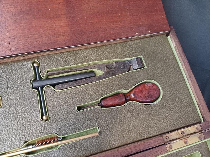 Die Pistole ist schussfähig und kommt in der abgebildeten Schatulle mit dem darin enthaltenen Zubehör. Die Schatulle ist aus jüngerer Zeit.