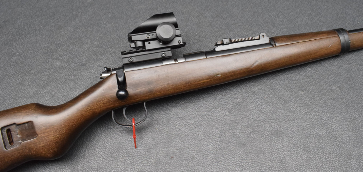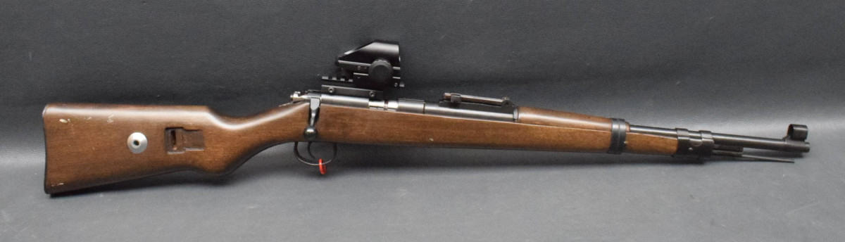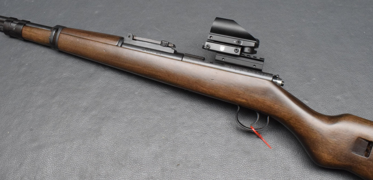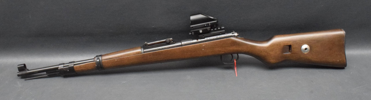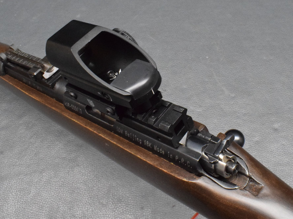 Montiert mit Nikko Sterling Red Dot Sight 1x22x33 rot/grün, mittels Aufschubmontage.