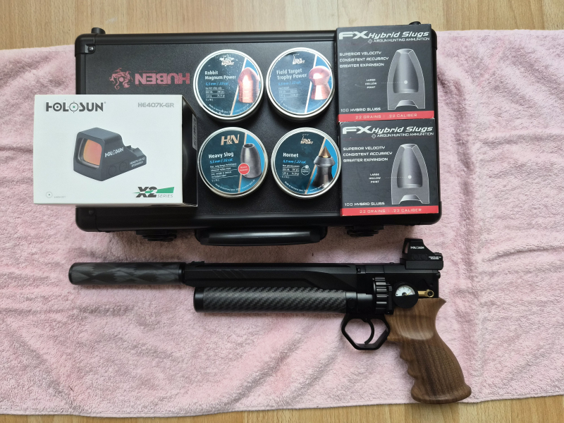 Im Komplettset sind enthalten: Huben GK1, Schalldämpfer (man kann sogar leise in geschlossenen Räumen üben, Reddot von Holosun K 407 (das beste auf dem Markt), ca. 750 Schuss Munition .22 (Slugs u. Diabolus - 5 Sorten), OVP mit Zubehör u. Exportkit sowie schwarzen Aluminiumkoffer, Tuningteile: Ladeklappe für schnelles Nachladen, Stopfen für Füllkanal, Schutzkappe für Manometer.