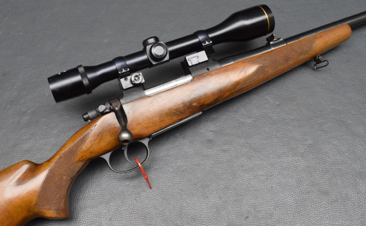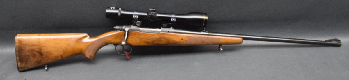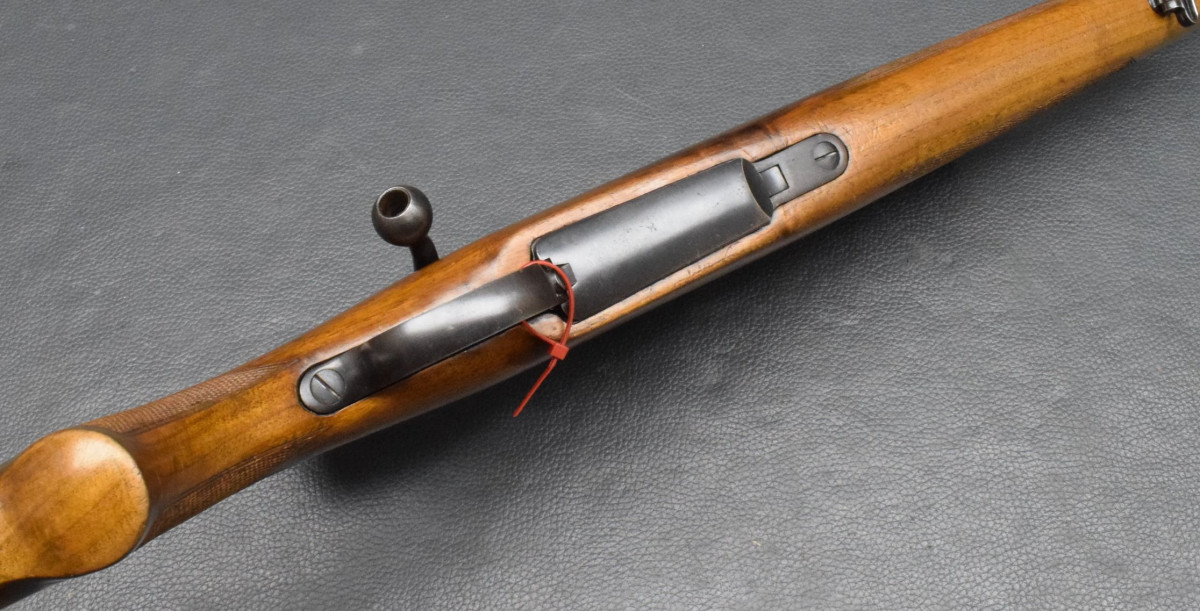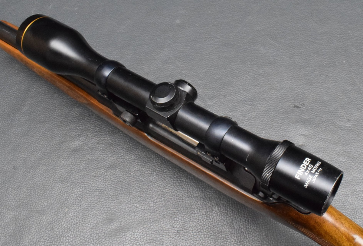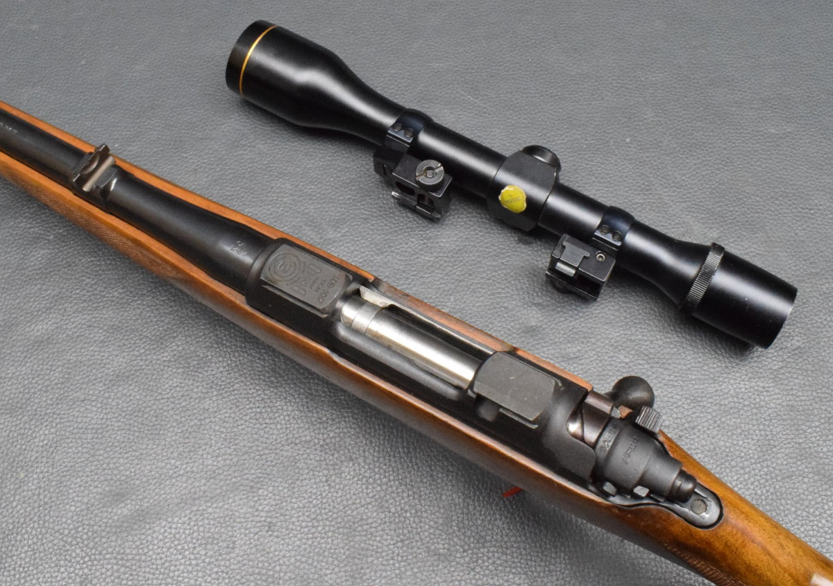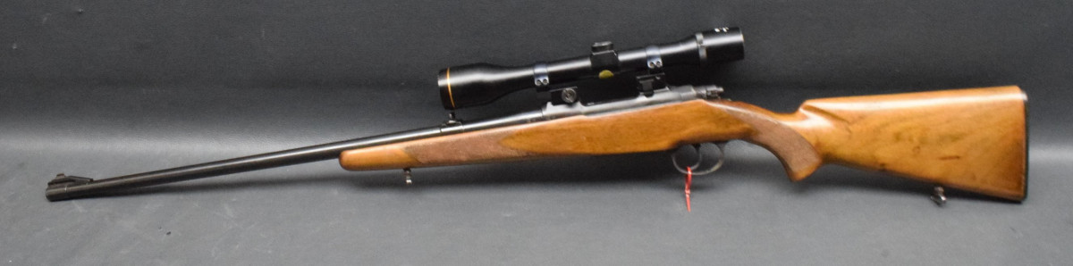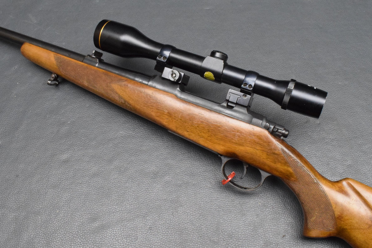 montiert mit Zielfernrohr Finder 4x40 Abs.1, mittels Aufschubmontage mit 25,4mm Ringen. Nußbaumschaft ohne Backe, Riemenbügeln und Schaftkappe. Lauf sehr gut, Brünierung 97%, Schaft gut