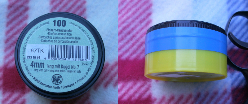 Eine noch original versigelte Plastikdose mit 100 Patronen 4mm Randzünder Kugel Nr. 7.