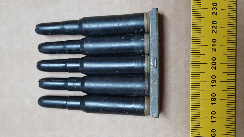 Sammlermunition: 5 Dekopatronen 7,62x51 Platz Plastik schwarz. Auf Ladestreifen..