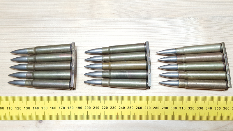 Sammlermunition: 15 Dekopatronen 7,9- 1.WK Deutsch auf Ladestreifen.
