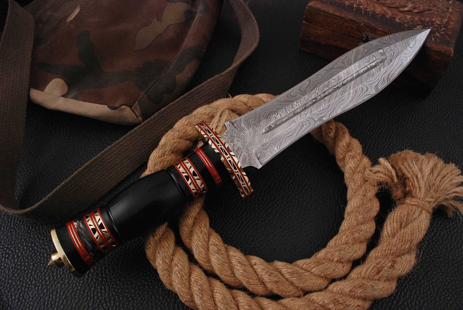 Die Klinge besteht aus echtem Damaststahl, geschmiedet aus den hochwertigen Stahlsorten 1095 & 15N20 – fünfmal gefaltet, was zu insgesamt 288 Lagen führt. Das ergibt eine besonders feine Maserung und sorgt für: