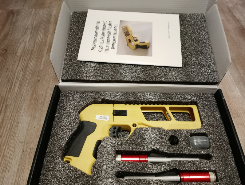 Der Scuba-Ringer ist ein Unterwassersportgerät, welches zwei Mini-Harpunen mittels Druckluft beschleunigen kann. Der 'Scuba Ringer' ist zweischüssig und wird mit zwei Druckluftkartuschen geladen, an denen Pfeilabschussrohre angeschraubt werden. Diese Kartuschen sind wiederverwendbar, können mittels einer Handpumpe, einer Druckluftflasche oder einem Kompressor befüllt werden (250 bis 300 bar). (Nicht enthalten)