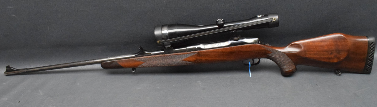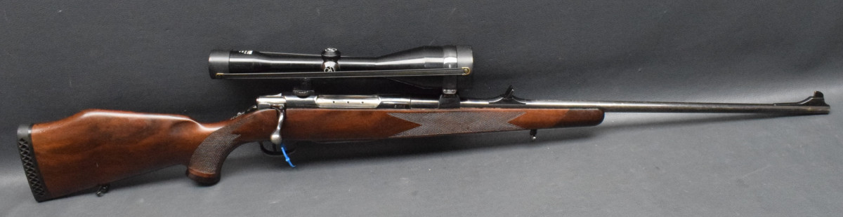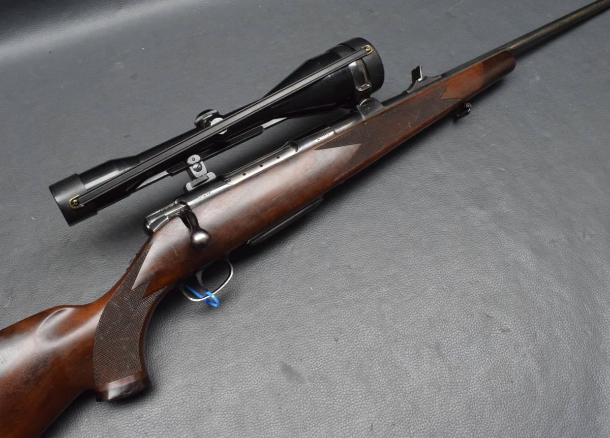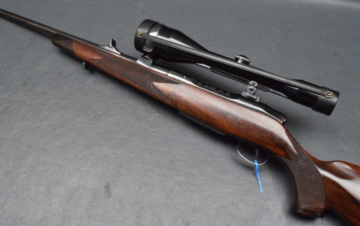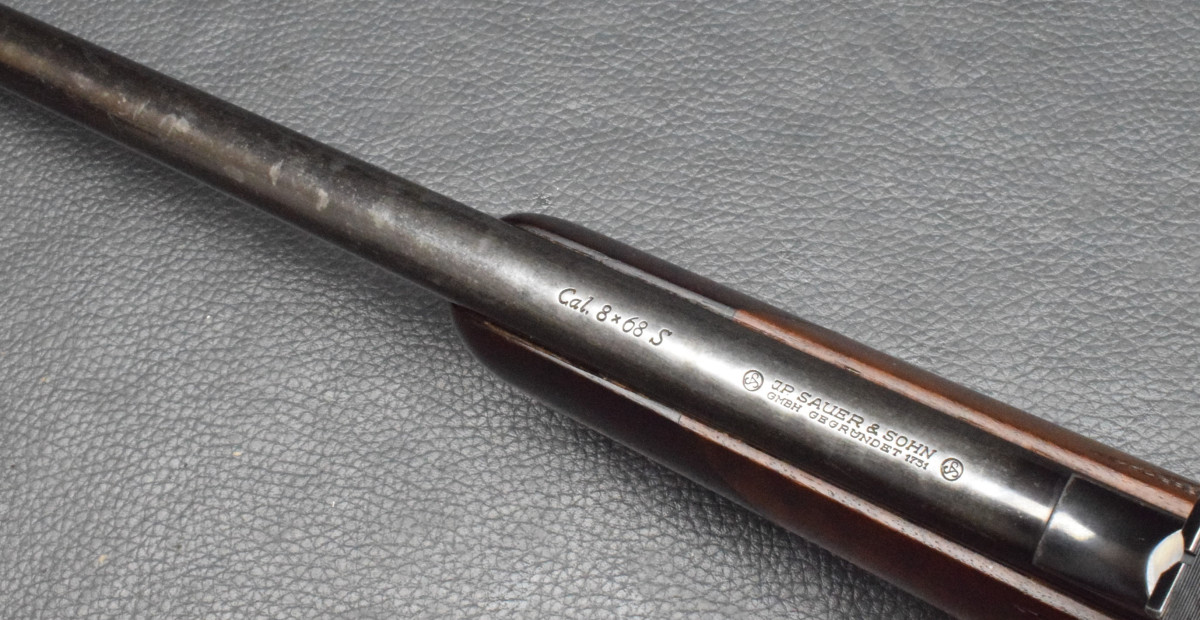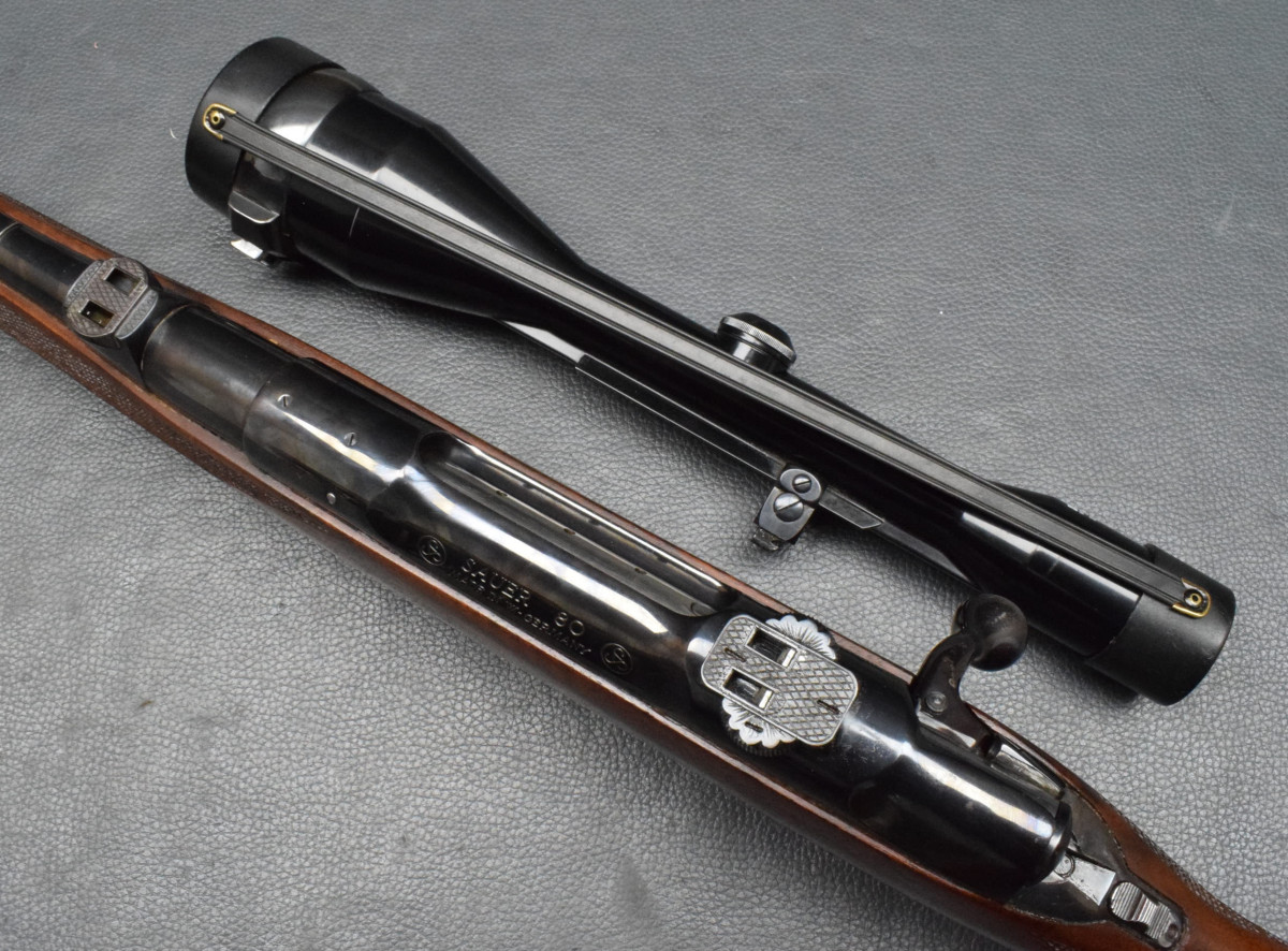 Nußbaumschaft mit deutscher Backe, Gummischaftkappe, Riemenbügeln. Lauf sehr gut, Brünierung 95%, Schaft gut