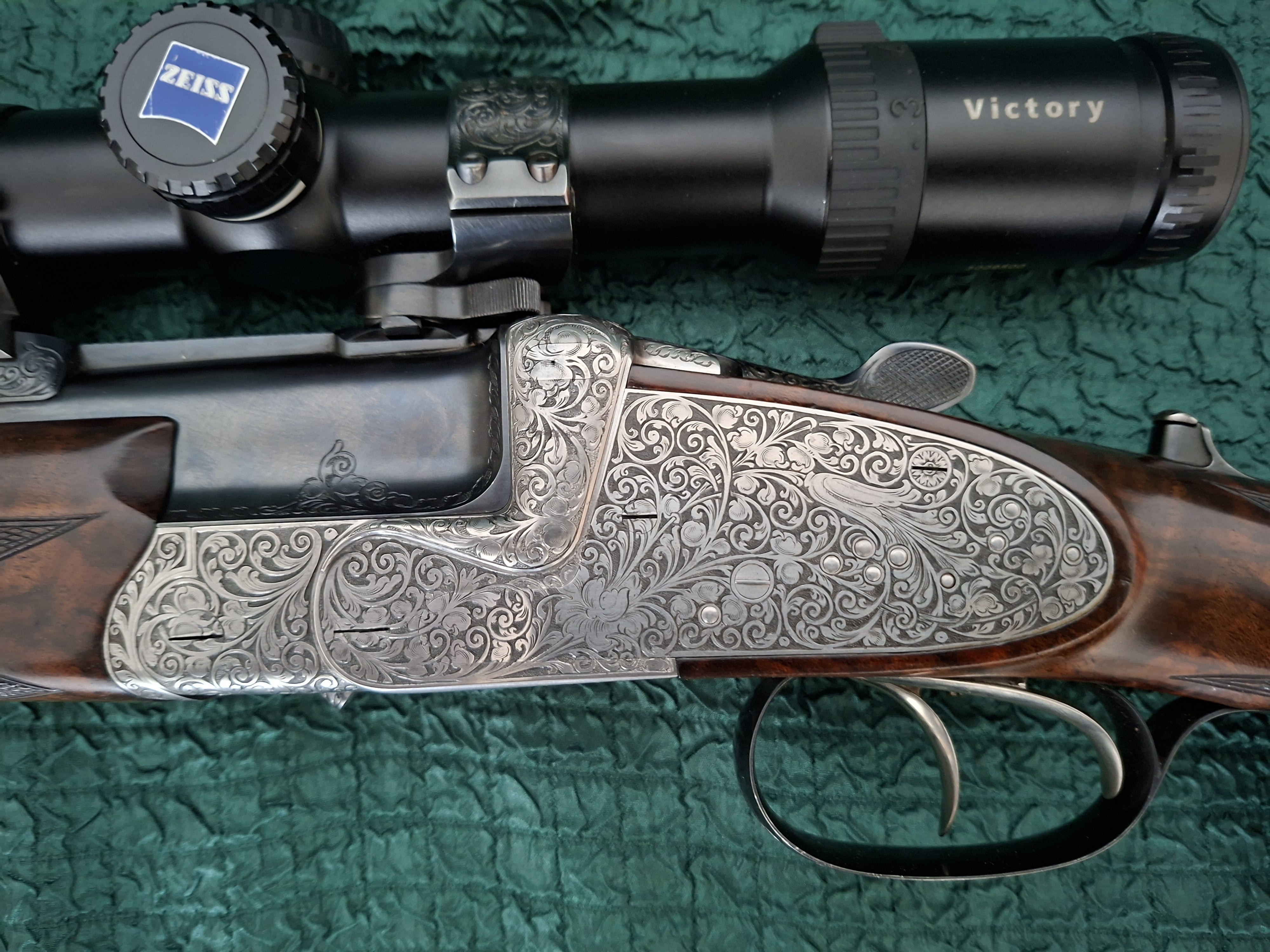 Gravuren: besonders reichhaltige und im Detail fein gestaltete altdeutsche Laubgravuren auf System, Seitenschlossen, Abzugsbügel, Muscheln, Scheibe, Schnäpper und Zielfernrohr-Montageteilen (Laufsockel und Ringen)