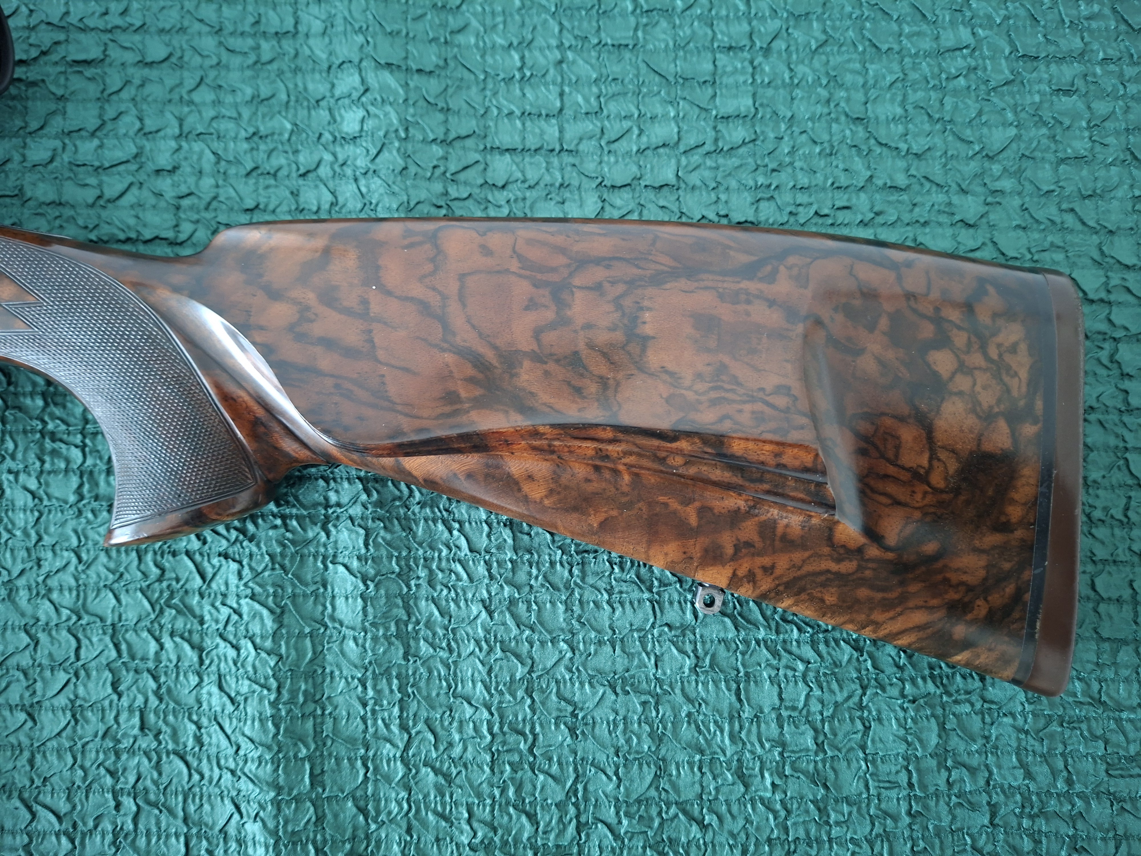 Schaft: aus 1a Nussbaum Wurzelholz mit gleichmäßiger, außergewöhnlich guter Wolkung im gesamten Hinterschaftbereich, im Pistolengriffbereich in Längsmaserung übergehend und im Schafthalsbereich sehr gesunder Faserverlauf, Kaisergriff, feine Fischhaut, Krawatte, Bayr. Backe mit 2 Falzen und leichtem Schweinsrücken, Pachmeier Kappe old. engl. Braun, Schaftlänge 37 cm.