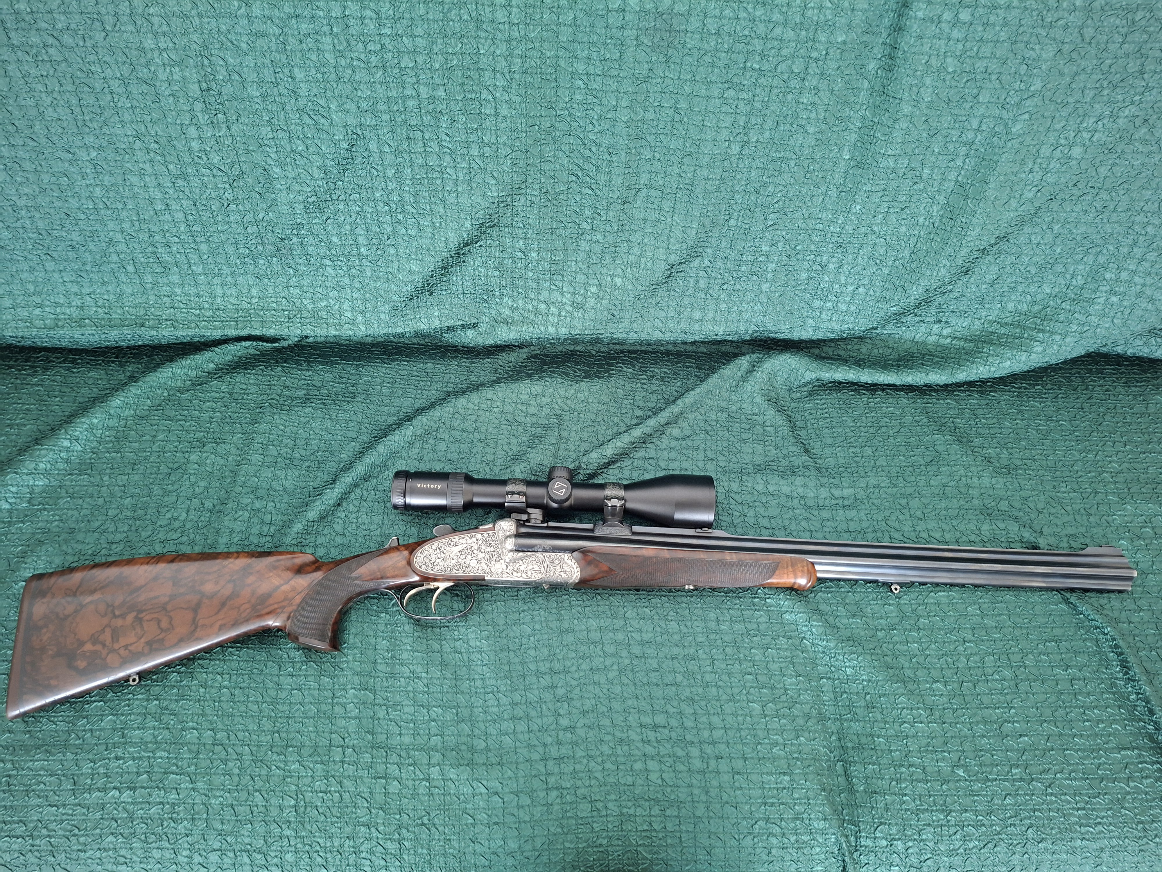 Zum Verkauf kommt ein Seitenschlossdrilling der Fa. Jakob Koschat, Ferlach Fabr.-Nr.: 26.1697, handgearbeitetes Unikat.