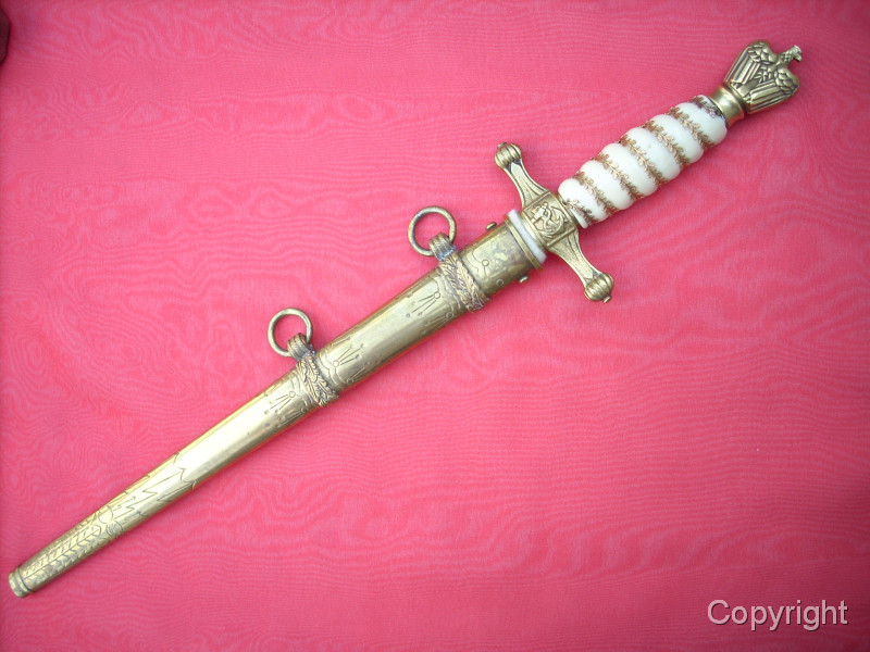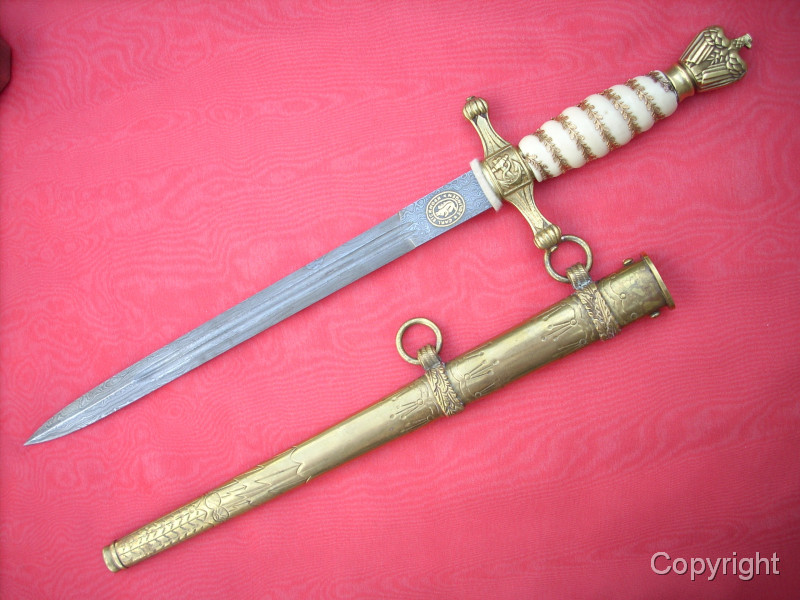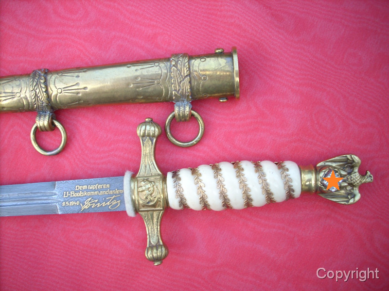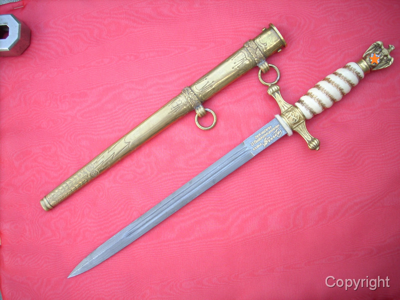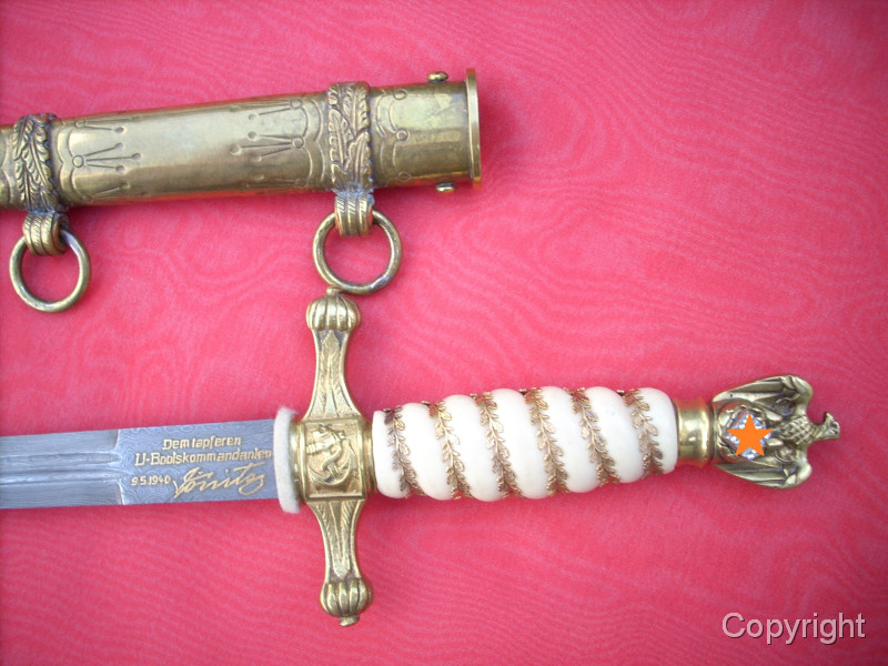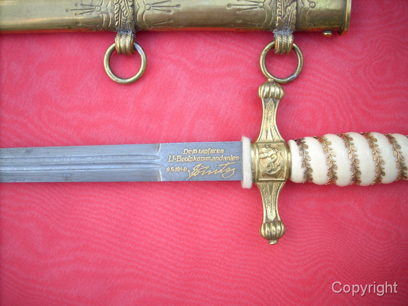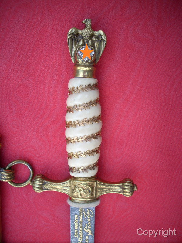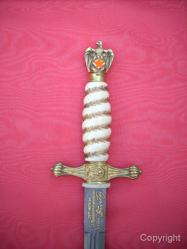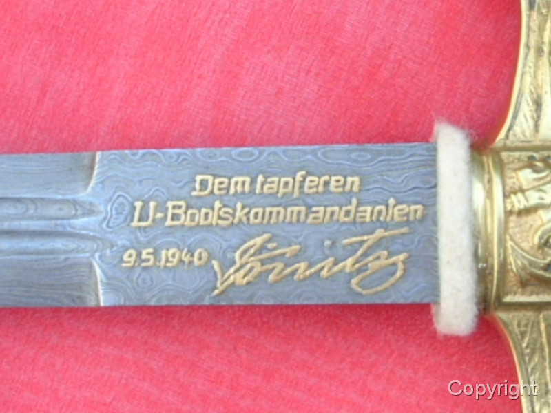 Ehrendolch mit Brillanten der Kriegsmarine mit Widmung “Dem tapferen U-Bootskommandanten” von Großadmiral Dönitz vom 9. Mai 1940. Diese Ehrendolche wurden seinerzeit nur in ganz geringer Stückzahl ausschließlich von der Fa. Eickhorn gefertigt. Ein Original mit diesem Verleihungsdatum erhielt seinerzeit der berühmte Schwerterträger Erich Topp für seine herausragenden Leistungen als U-Boot-Kommandant. Blitze auf der Scheide umlaufend. Klinge mit sehr feinem Ätzdamast und magnetisch, Widmung und Eickhornlogo erhaben und vergoldet. Keine Haltefeder und kein Drücker, genau wie beim unbezahlbaren und nicht beschaffbaren Original. Zum Adler: es wurde hier auf den Adler, wie beim Original, ein silberfarbenes und mit 17 Simili-Steinen besetztes Hakenkreuz aufgelegt, die bei entsprechendem Lichteinfall herrlich funkeln. Sehr seltene Gelegenheit zum Erwerb eines solchen Dolches, die wohl so schnell nicht wiederkommt. Keine Garantie und keine Rücknahme.