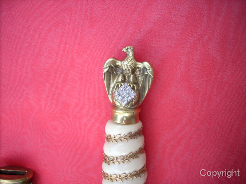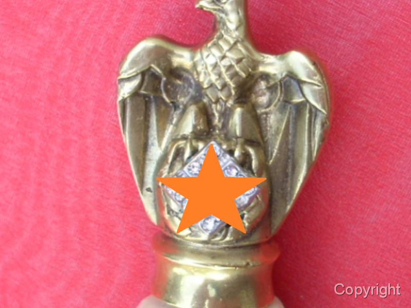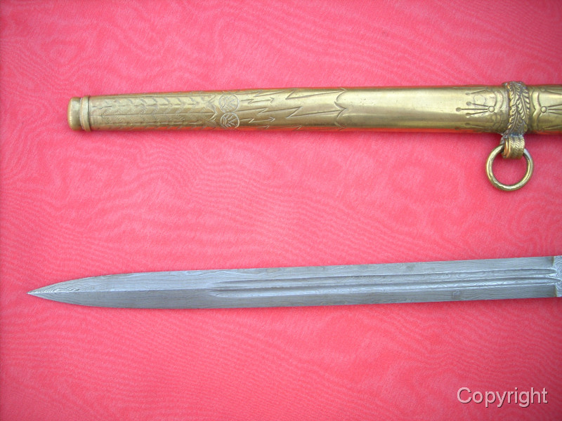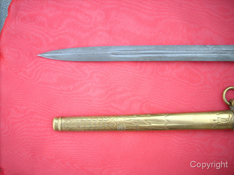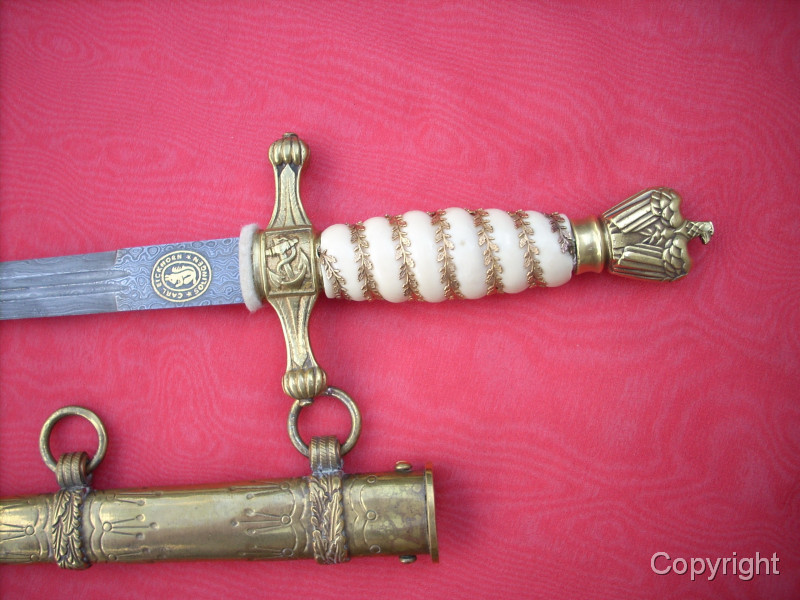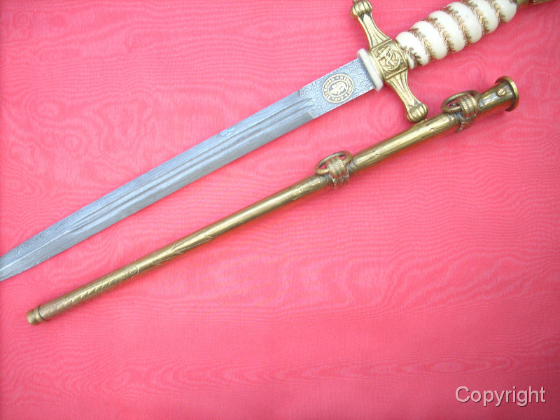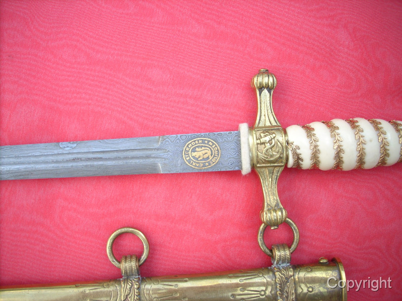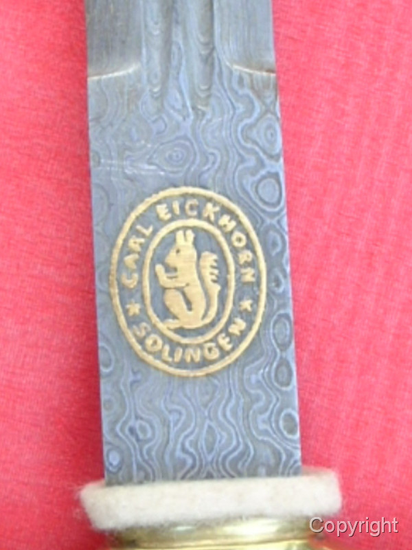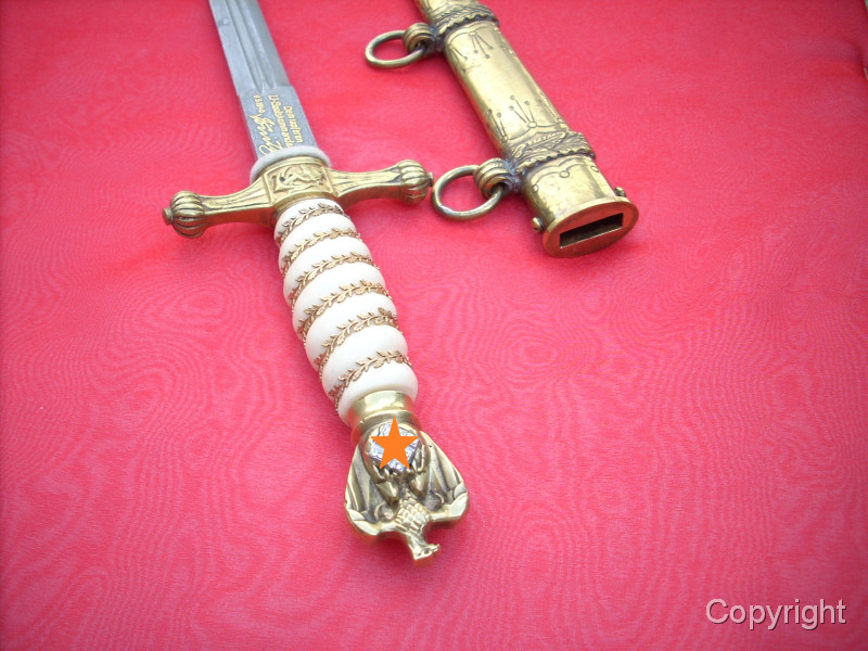 Ehrendolch mit Brillanten der Kriegsmarine mit Widmung “Dem tapferen U-Bootskommandanten” von Großadmiral Dönitz vom 9. Mai 1940. Diese Ehrendolche wurden seinerzeit nur in ganz geringer Stückzahl ausschließlich von der Fa. Eickhorn gefertigt. Ein Original mit diesem Verleihungsdatum erhielt seinerzeit der berühmte Schwerterträger Erich Topp für seine herausragenden Leistungen als U-Boot-Kommandant. Blitze auf der Scheide umlaufend. Klinge mit sehr feinem Ätzdamast und magnetisch, Widmung und Eickhornlogo erhaben und vergoldet. Keine Haltefeder und kein Drücker, genau wie beim unbezahlbaren und nicht beschaffbaren Original. Zum Adler: es wurde hier auf den Adler, wie beim Original, ein silberfarbenes und mit 17 Simili-Steinen besetztes Hakenkreuz aufgelegt, die bei entsprechendem Lichteinfall herrlich funkeln. Sehr seltene Gelegenheit zum Erwerb eines solchen Dolches, die wohl so schnell nicht wiederkommt. Keine Garantie und keine Rücknahme.