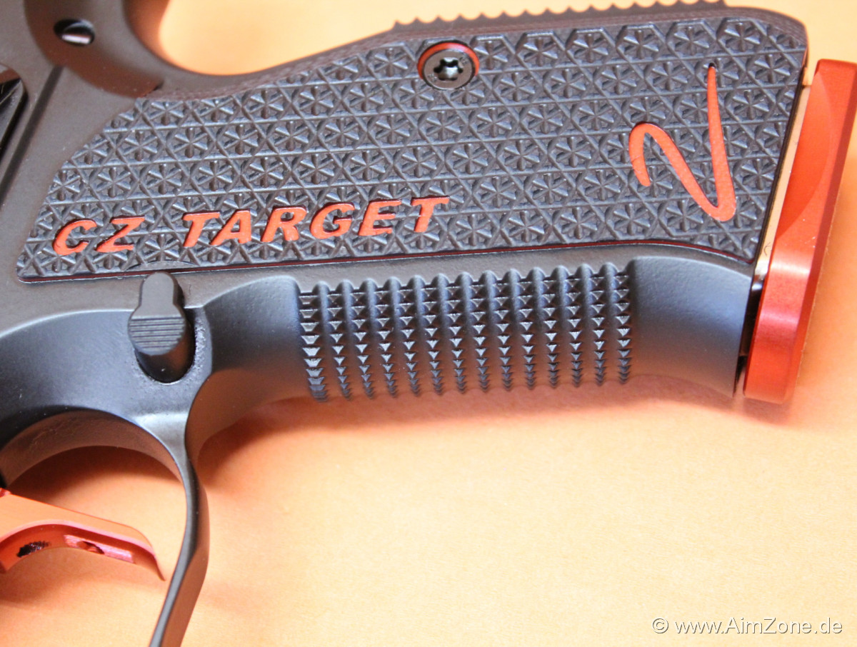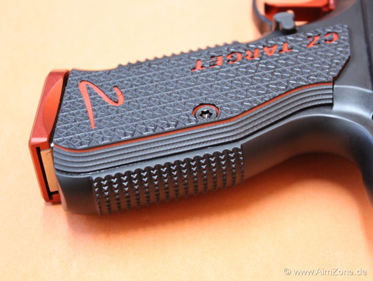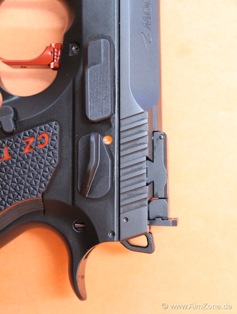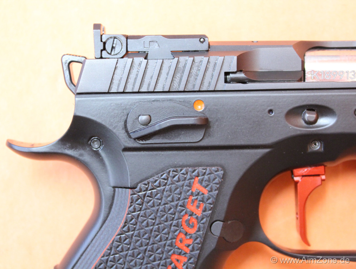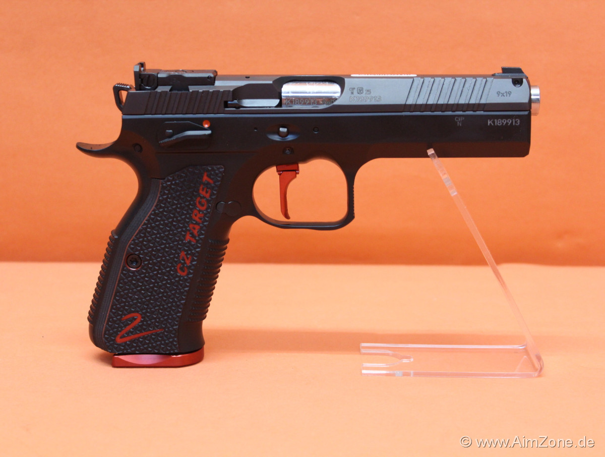 System CZ 75, 122mm Lauf, Sportkorn, LPA-Mikrometervisierung, Griffstück mit langem Dustcover (OHNE Zubehörschiene), vergrößerter Schlittenfanghebel, beidseitiger vergrößerter Sicherungshebel, einstellbarer SA Abzug (ca. 5 - 20N/ Auslieferzustand ca. 10N) mit einstellbarem Triggerstop/ Züngelposition (OHNE Schlagbolzensicherung), schwarz/rote G10-Griffschalen, 17-Schuß Magazin. Incl. 2 Stück Reservemagazine/ Reinigungsset/ Ersatzpuffer/ Ersatzkorn. Textilkoffer als Transportverpackung.