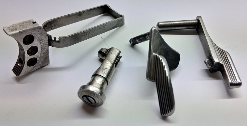 Angeboten ist ein Konvolut Match-Abzug, verlängerter Daumensicherung, Schlittenfang, Magazin-Auslöser für Pistole 1911, Teilesatz.