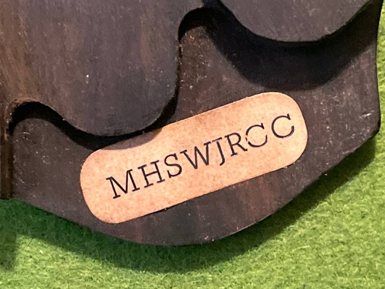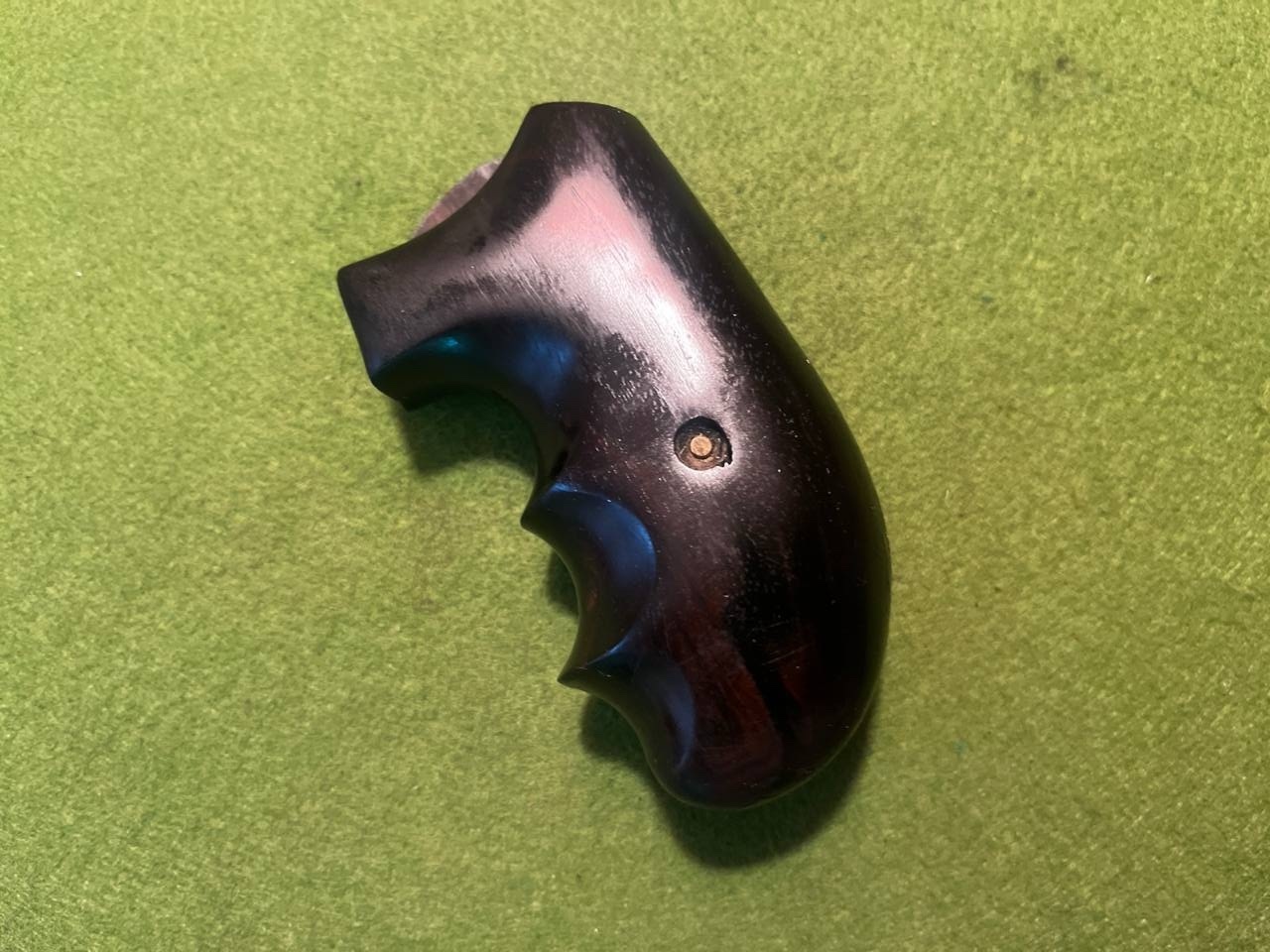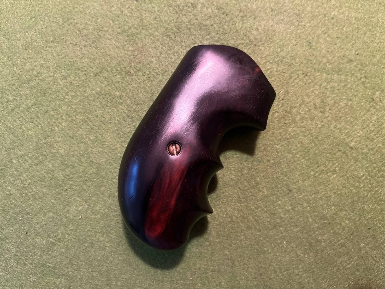 mit ihrer originalen Befestigungsschraube. Es handelt sich um eine hochwertige Ausführung mit einer leicht angedeuteten Daumenauflage für Rechtshänder aber durchaus verwendbar auch für Linkshänder; aus hartem Edelholz und mit durchgehender Schraube, hier noch die Ansicht links