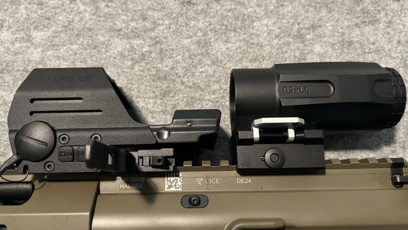 Die Büchse ist mit dem sehr hochwertigem Reflexvisier Falke LE QL Gen2 und dem Falke Magnifier B5X LE FlipUp ausgestattet und damit auch eingeschossen.