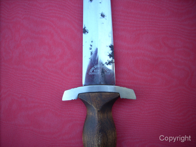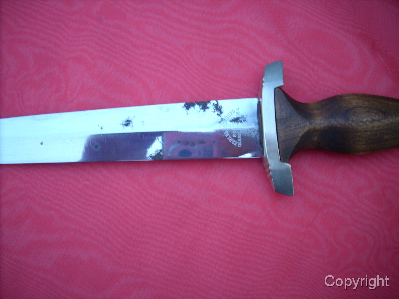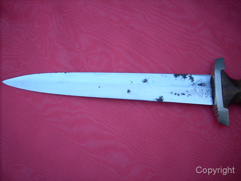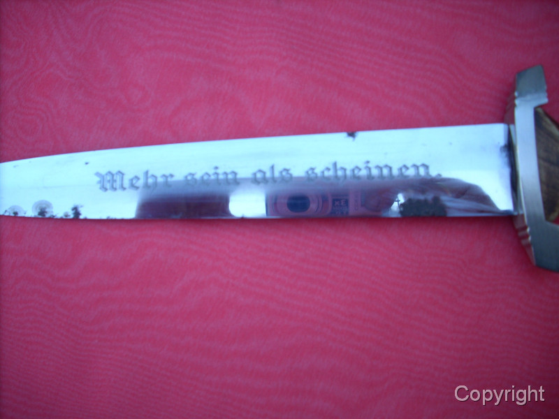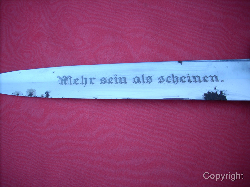 NAPOLA / NPEA – Schülerdolch ohne Scheide. Klinge mit einigen Stellen und mit Stoßleder in der Parierstange. Herstellerlogo Karl Burgsmüller Berlin-Charlottenburg 5. Das Motto auf der Vorderseite (Mehr sein als scheinen) ordentlich, tief und sauber geätzt. Klinge magnetisch, die übrigen Metallteile antimagnetisch. Gesamtzustand siehe die Fotos, die, wie immer, Bestandteil der Artikelbeschreibung sind. Keine Garantie und keine Rücknahme. Das versehentlich mitfotografierte Metallteil gehört nicht zum Angebot.