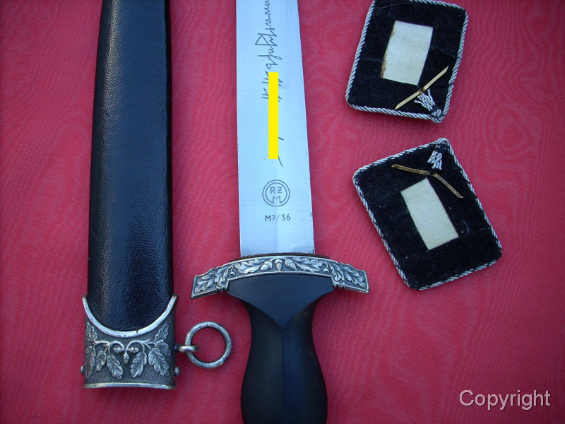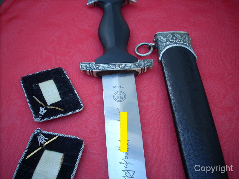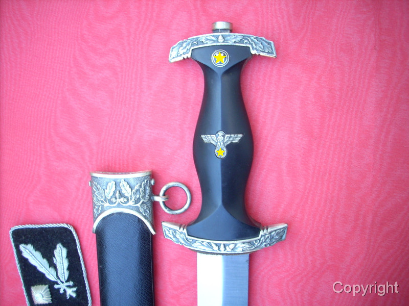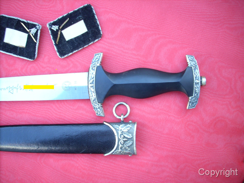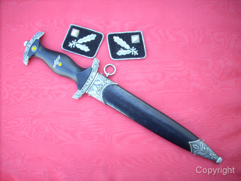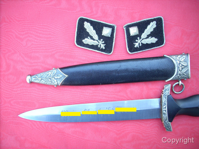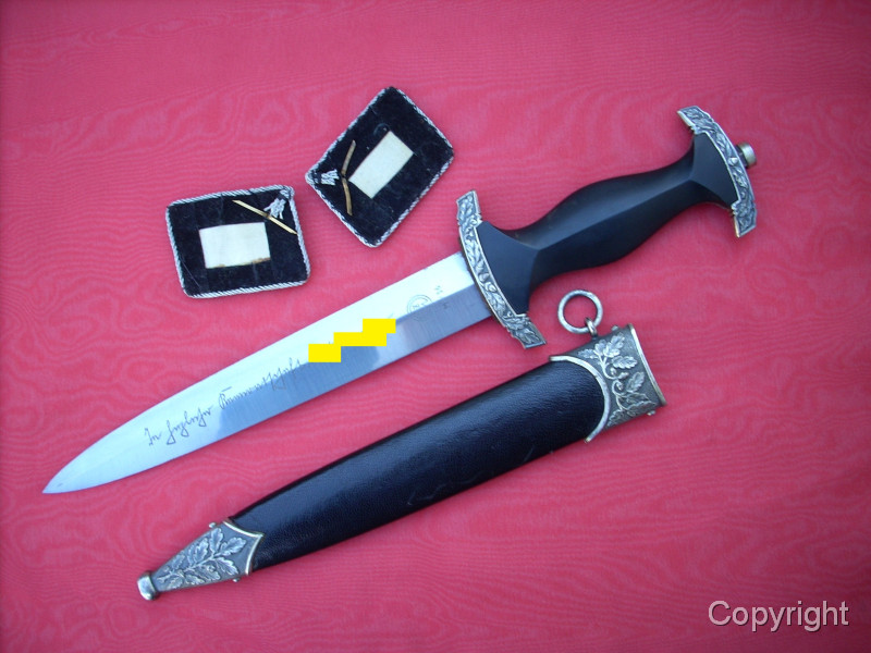 Sehr schönes Set eines SS-Ehren-Dolches mit bezogener Scheide und Verzierungen, sog. Himmler-Dolch mit rückseitig eingeätzter Himmler-Widmung (In herzlicher Kameradschaft H.Himmler) und einem Paar Kragenspiegel für einen SS-Brigadeführer/Generalmajor (metallfaden handgestickte Eichenblätter mit Rangsternen aus Metall). Alle Eichenlaub-Teile des Dolches äußerst filigran ausgearbeitet, Klinge mit Stoßleder. RZM-Herstellercode RZM M7/36 (steht für E. & F. Horster, Solingen). Das Motto auf der Vorderseite der, durch viele schöne Pliestspuren aufgewerteten Klinge, sowie die Widmung auf der Rückseite ordentlich und schön tief geätzt. Klinge, Scheide, Schrauben und Tragering magnetisch, die übrigen Metallteile antimagnetisch. Adler und Pastille akkurat eingesetzt, Pastille sauber emailliert. Kopfschraube und Beschlagschrauben unbeschädigt. Gesamtzustand siehe die Fotos, die, wie immer, Bestandteil der Artikelbeschreibung sind. Leichte Gebrauchsspuren. Keine Garantie und keine Rücknahme.