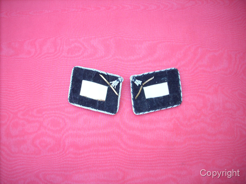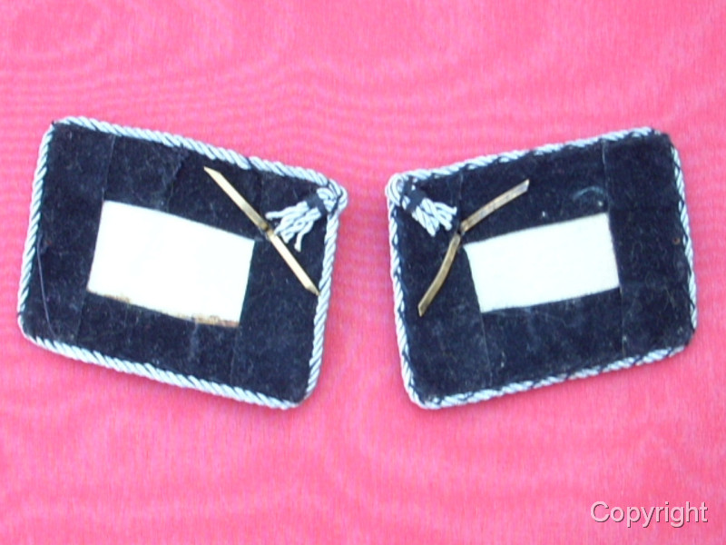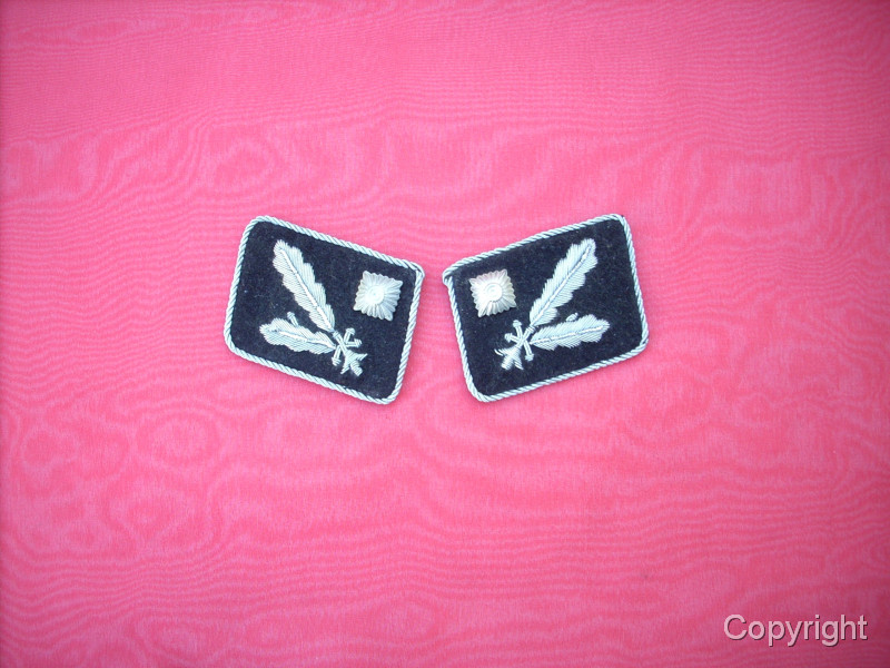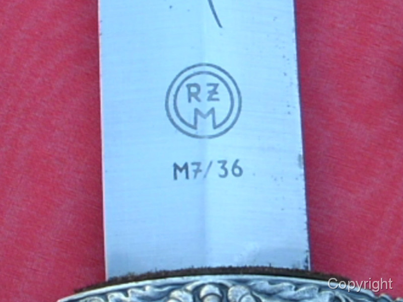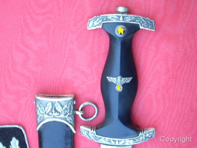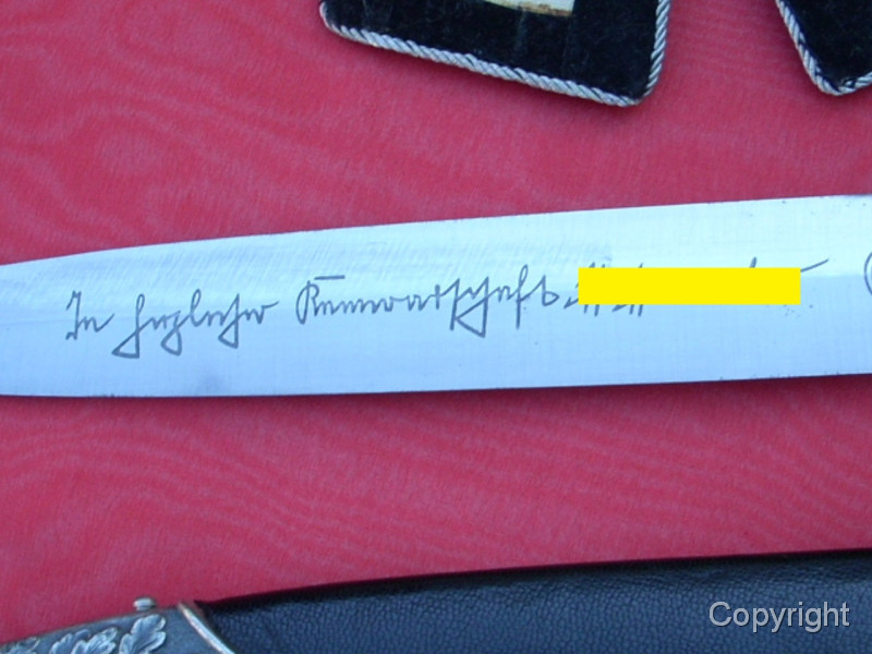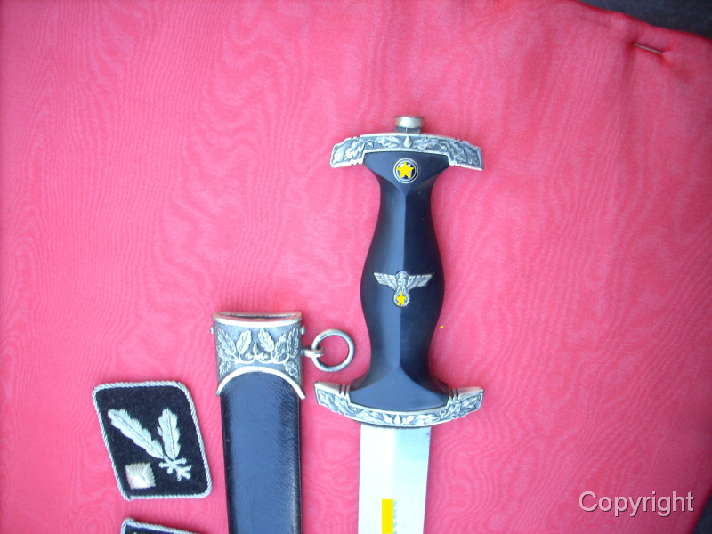 Sehr schönes Set eines SS-Ehren-Dolches mit bezogener Scheide und Verzierungen, sog. Himmler-Dolch mit rückseitig eingeätzter Himmler-Widmung (In herzlicher Kameradschaft H.Himmler) und einem Paar Kragenspiegel für einen SS-Brigadeführer/Generalmajor (metallfaden handgestickte Eichenblätter mit Rangsternen aus Metall). Alle Eichenlaub-Teile des Dolches äußerst filigran ausgearbeitet, Klinge mit Stoßleder. RZM-Herstellercode RZM M7/36 (steht für E. & F. Horster, Solingen). Das Motto auf der Vorderseite der, durch viele schöne Pliestspuren aufgewerteten Klinge, sowie die Widmung auf der Rückseite ordentlich und schön tief geätzt. Klinge, Scheide, Schrauben und Tragering magnetisch, die übrigen Metallteile antimagnetisch. Adler und Pastille akkurat eingesetzt, Pastille sauber emailliert. Kopfschraube und Beschlagschrauben unbeschädigt. Gesamtzustand siehe die Fotos, die, wie immer, Bestandteil der Artikelbeschreibung sind. Leichte Gebrauchsspuren. Keine Garantie und keine Rücknahme.