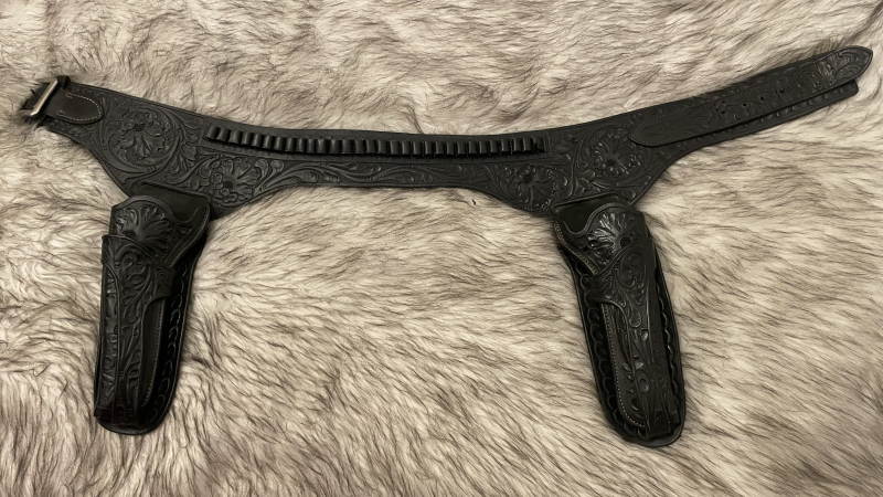 HOCHWERTIGES BUSCADERO RIG MADE IN USA. TEXAS JOCKSTRAP HOLSTER . HOLSTER UNS GÜRTEL VON HAND MIT BLUMEN MUSTER VERZIERT. ES PASSEN SAA REVOLVER BIS 7,5" LAUF REIN. TOP LEDER UND VER ARBEITUNG. ALLERDINGS KÖNNTE ES MAL WIEDER ETWAS FETT GEBRAUCHEN. DAS RIG EIGNET SICH PERFEKT ZUR DARSTELLUNG der 1920ER JAHRE ODER DIE HOLSTER AUFE EINEN ANDEREN GÜRTEL ZIEHEN DANN AUCH FÜR DIE 1890ER UND 1900. IN DEN USA SIND DAS ECHTE SAMMLERSTÜCKE UND HEUTE NICHT MEHR UNTER 600 bis 900 DOLLER ZUBEKOMMEN. ES NOCH ES HAT 30 PATRONENSCHLAUFEN KAL. 45, EINE IST EINGERISSEN / GANZ RECHTS. LÄNGE BIS ZUM ERSTEN LOCH SIND 93CM UND BIS ZUM LETZTEN LOCH 103CM. DIE GESAMDLÄNGE VON SPITZE ZU SPITZE 112CM. SCHWARZES LEDER. SIEHT NOCH BESSER AUS ALS AUF DEN FOTOS. ES IST KEIN NOTVERKAUF!!! HOFFE ES FINDET SICH EIN NEUER BESITZER DER ES ZU SCHÄTZEN WEISS. DAS RIG IST CA. 50 bis 75 JAHRE ALT. ALLES WEITERE ENTNEHMEN SIE BITTE DEN FOTOS.