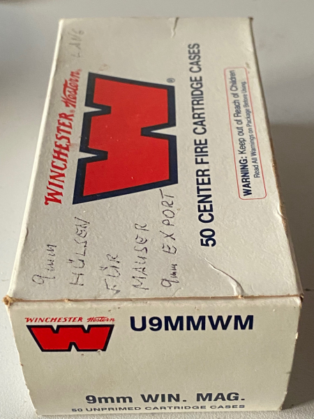 Heute biete ich eine Schachten mit 50 St. Winchester Hülsen im seltenen Kaliber 9mm WIN MAG an. Die Hülsen sind nagelneu und nicht gezündert. Auf der Schachtel ist noch schwach eine Beschriftung zu sehen, was aber wohl kaum stört, da die Hülsen kaum zu bekommen sind. Versand für € 5,-- als unversichertes Päckchen, wer versichert haben will € 7,-- (bitte angeben) Wie immer ist dies eine private Auktion ohne Garantie und keine Rücknahme. Today I'm offering a full box Winchester case in the rare caliber 9mm WIN MAG. The cases are brand new and unprimed. Shipping costs in the EU are € 12,00 (no insurance) Shipping costs for insured parcel are pretty expensive (€ 20,--). Pls. let me know what you prefer. This is a private auction without guaranty and no returns.