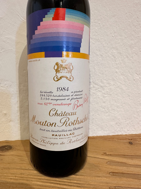 Auf Château Mouton Rothschild wartete man 1984 nach einem sehr wechselhaften Witterungsverlauf sehr lange mit der Weinlese, um das sonnige Oktoberwetter noch maximal auszunutzen. Die Trauben wurden schließlich vom 5. bis 12. Oktober eingebracht. Die Assemblage des 1984er Moutons hat einen vergleichsweise hohen Anteil an Cabernet Franc (10%) und Merlot (12%) und ist natürlich wie immer dominiert von Cabernet Sauvignon (78%). Der Wein hat sehr runde weiche Tannine und Fülle.