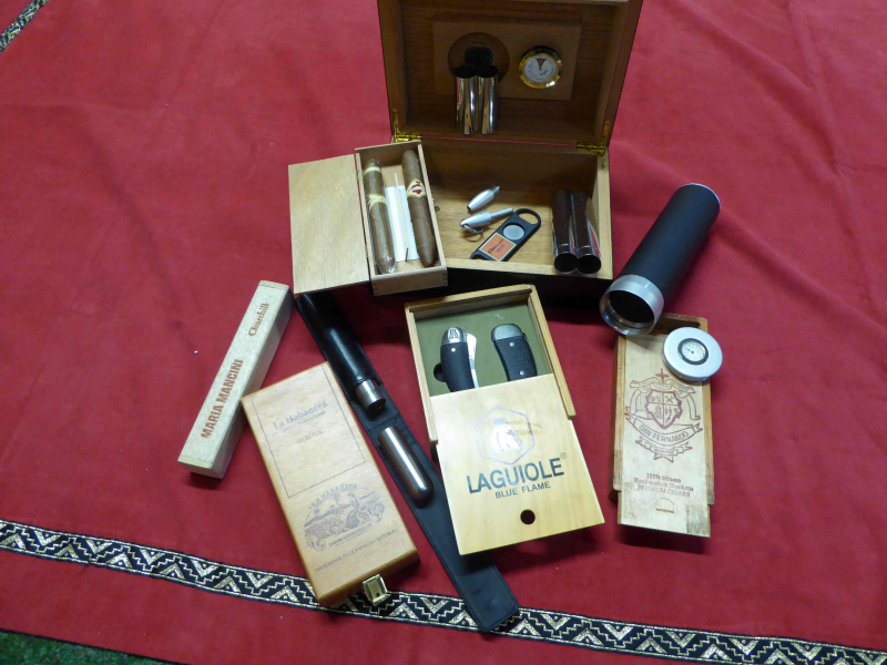 Zigarren Raucher Konvolut 11 Teilig.-----1e Humidor Holzschachtel schwarz , l 24 cm , b 18 cm , h 7 cm------ 1 Humidor aus Edelstahl, ----- Blue Flame Set, -----3 St leere Zigarren Holzschachteln,-----2 St. Brandy Zigarren, 1e leer und 1e original Verpackt,-----2e Edelstahl Behälter,-----1er Edelstahlbehälter mit Tasche.-----Rest siehe Bilder.-----Alle Angaben ohne Gewähr und Rückgabe, da Privatverkauf.