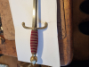 Ein sogenannter Misericordia (Gnadentöter) Evt. Gründerzeit Replik. Gesamtlänge 53cm, Klinge 37,5cm, Griff roter Samt mit gedrehtem messing Draht und Türkenbund Abschlüssen, Knauf ergänzt aus der Zeit (müsste noch geschliffen und poliert werden) Das Original habe ich in einem Buch gefunden aber ich weis nicht mehr in welchem.