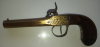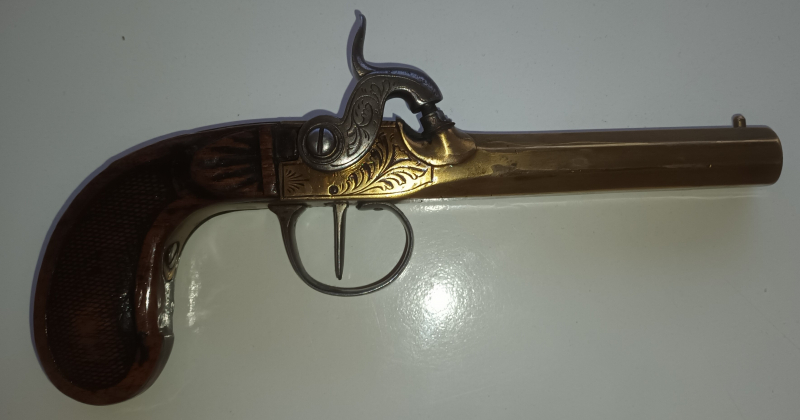 sie bieten auf eine schöne original Perkussionspistole (024) mit Messingkasten und Messinglauf. Der Lauf hat einen Innendurchmesser von 11,5mm, das Kaliber dürfte .45 sein und ist 8-Eckig. Die Hahnfeder ist in Ordnung. Die Stahlteile haben keine Rostnarben. Der die Waffe und der Hahn sind schön graviert.