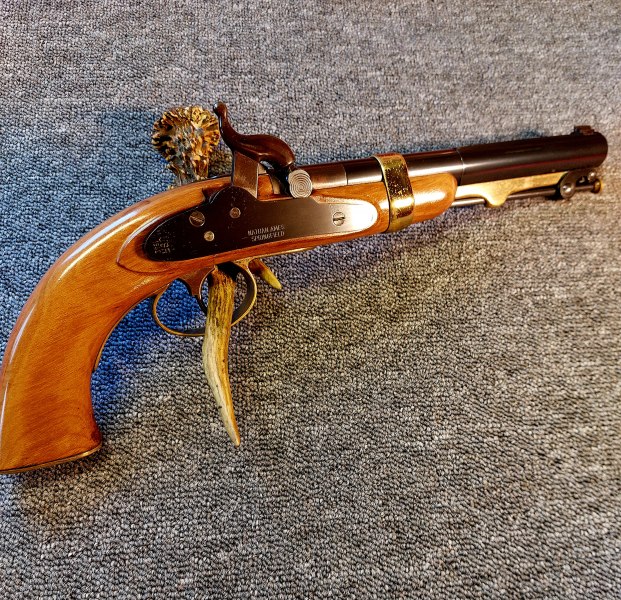 Ich biete eine von einem alten Meister nachgebaute Pistole im Kal. 45 an. Sie hat einen spiegelblanken gezogenen Lauf. Alle Teile sind aus Metall, und der Schaft ist aus Hartholz. Die Schaftabschlußkappe ist aus Messing mit Jahreszahl und die Initialen des Meisters. Die Wafffe ist ohne ersichtlichen Macken ! Die Lauflänge ist ca. 21 cm, die Gesamtlänge ca. 37 cm und das Gewicht ca. 0,9 kg . Sie hat keinen Beschuss ist deshalb DEKO ! Der Hahn hält nur, in der Feuerraste, wenn der Abzug nach vorne gedrückt wird ! Deshalb verkaufe ich diese Pistole als DEFEKT ! Ansonsten entnehmen Sie den Zustand der Waffe bitte den Bildern. Privatverkauf- Die Ware wird unter Ausschluss jeglcher Gewährleistung verkauft- keine Rücknahme- nur Innlandsverkauf, gerne auch Selbstabholung, Altersnachweis erforderlich.