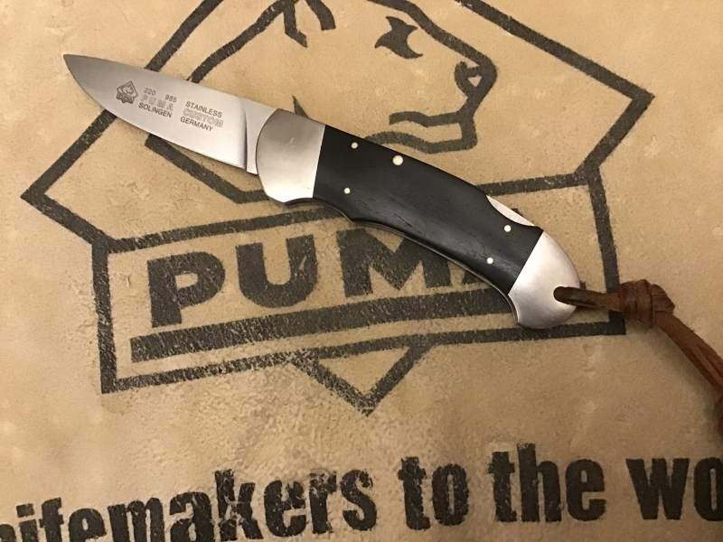 Verkaufe mein Puma Taschenmesser, Griffschalen Ebenholz , Richard Hehn Design , Klingenbeschriftung - eine Seite 220 985 Puma Solingen, Stainless Custom Germany und Puma Logo. Andere Seite DESIGN Hehn Handmade. Hergestellt 1. Halbjahr 1992.