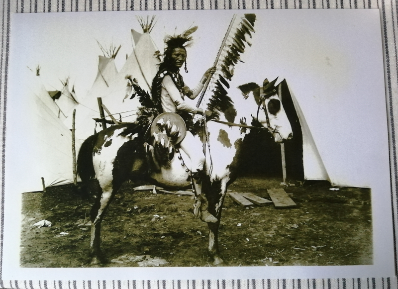 1 x vermutlich älterer Foto Abzug vom historischen Original des bekannten Sioux Häuptlings " Two Sticks", Größe ca. 30 x 21 cm, das Foto zeigt den Häuptling Ende des 19. Jahrhunderts in typischer Kleidung auf seinem Pferd mit entsprechendem zeitgenössischen Hintergrund. Über das Alter vom Foto Abzug selbst kann ich nichts sagen, keine Stempel ersichtlich.